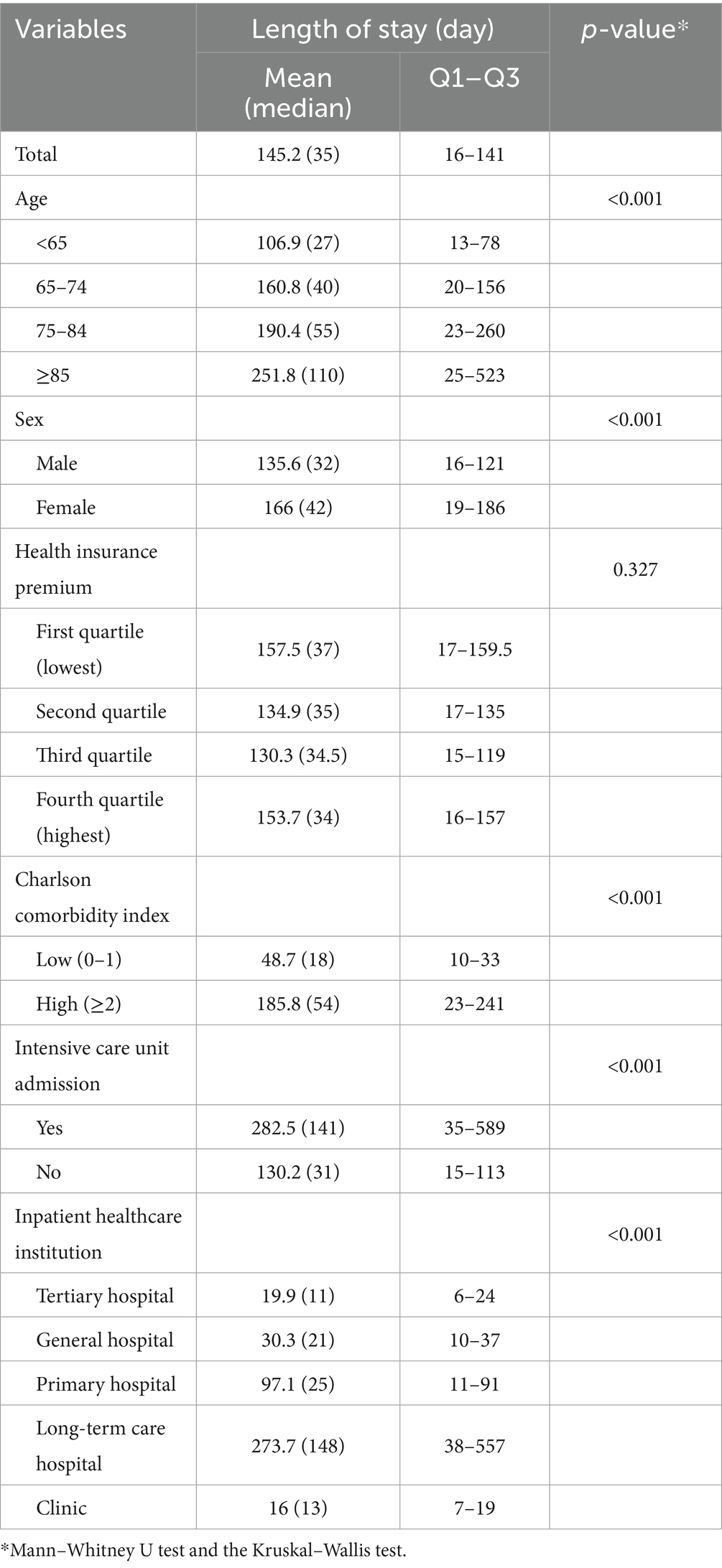 The group that received inpatient rehabilitation was hospitalized for a mean of 145.2 days during the follow-up period [median (Q1–Q3): 35 (16–141) days] (Table 2). Older and female patients had longer LOS (both p < 0.001). Patients with high CCI scores and those with a history of ICU admission also had longer LOS (both p < 0.001). Among the types of healthcare institutions, the mean LOS was longest in LTCHs (273.7 days, p < 0.001), followed by primary hospitals, general hospitals, tertiary hospitals, and clinics.