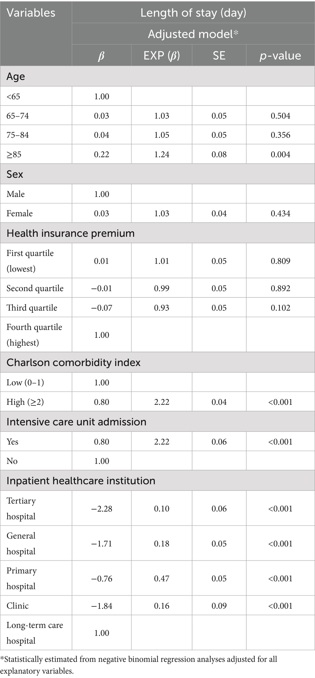 Examination of the factors influencing LOS revealed that a lower health insurance premium was significantly associated with a longer LOS when the inpatient healthcare institution variable was not included in the model (Supplementary Table S3). However, this association was no longer significant after including the inpatient healthcare institution variable (Table 3). Similarly, older age was significantly associated with a longer LOS when the inpatient variable was excluded; however, this association disappeared when the inpatient variable was added. The Mann–Whitney U and Kruskal–Wallis tests indicated that both health insurance premium and age were associated with inpatient healthcare institutions; however, neither variable exhibited multicollinearity. In addition, the model that included the inpatient healthcare institution variable had lower AIC and BIC values than the model without it. These findings suggest that while individual variables such as health insurance premium and age initially appeared to significantly affect LOS, their influence became non-significant when a more dominant variable, the type of inpatient healthcare institution, was included in the model. Therefore, the type of healthcare institution to which a patient is admitted following acute treatment may have a more significant impact on LOS than health insurance premium or age.