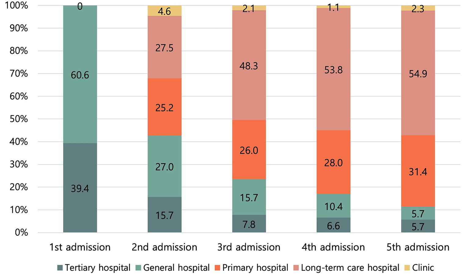 The healthcare institutions where patients received medical services were classified as tertiary hospitals, general hospitals, primary hospitals, long-term care hospitals (LTCHs), and clinics. The proportion of each type of healthcare institution was examined at each stage of hospitalization.
