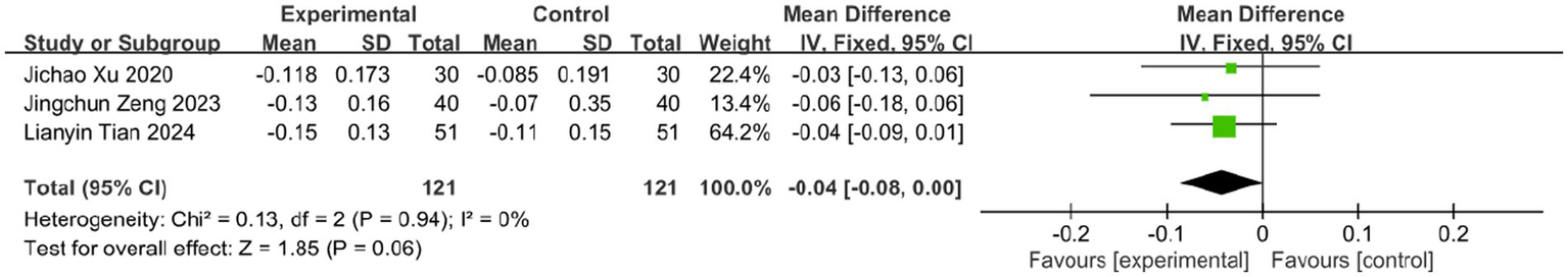 Continuous variable outcomes were analyzed using MD. When p < 0.05, it was considered statistically significant. For results using different units, we used MD with a 95% CI to represent the aggregate estimate. We intuitively assess heterogeneity based on I (2) value. When the heterogeneity is greater than 50%, the random effects model is adopted, otherwise the fixed effects model is adopted (36, 37). The DerSimonian–Laird estimator was used for the random-effects model to account for between-study variance in heterogeneity. Begg’s funnel plot and Egger’s linear regression test were applied to evaluate publication bias. Subgroup analyses were pre-specified to explore potential sources of heterogeneity including variations in bloodletting techniques. These were planned a priori in the study protocol (PROSPERO: CRD420251110060). Data compilation and statistical analysis were performed using Review Manager 5.4.