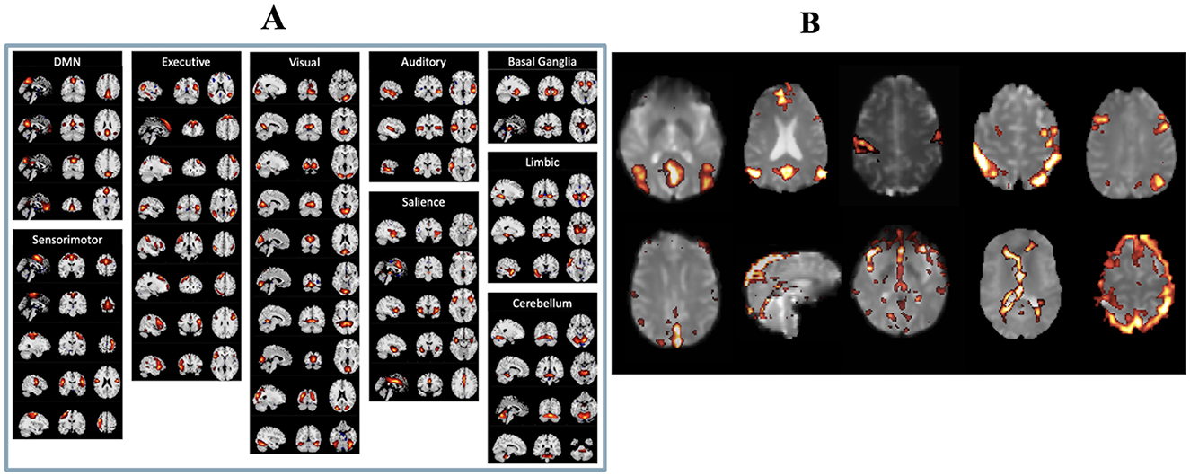 Figure 1. (A) List of real resting state functional networks. (B) Examples of independent components considered to be real (top row) and independent components considered to be artifactual (bottom row).