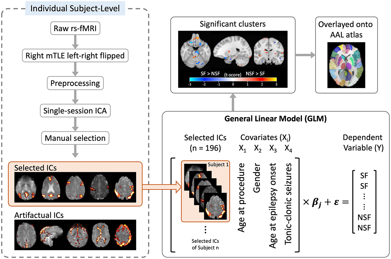 Flowchart detailing the analysis process using rs-fMRI data. The individual subject-level steps include raw data input, right mTLE flipping, preprocessing, single-session ICA, and manual selection. Selected ICs are displayed, distinguishing them from artifactual ICs. Significant clusters are visualized with t-scores, indicating differences between SF and NSF. These are overlaid onto an AAL atlas. The General Linear Model (GLM) section includes selected ICs, covariates (age at procedure, gender, age at epilepsy onset, tonic-clonic seizures), and the dependent variable, highlighting the relationships explored in the analysis.