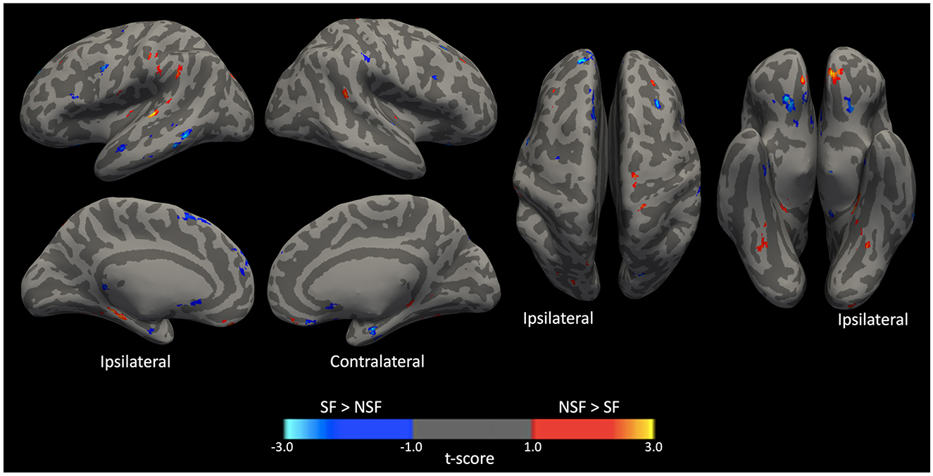Brain surface renderings showing functional MRI data in both ipsilateral and contralateral views. Color mapping indicates t-scores, with blue for SF greater than NSF and red-yellow for NSF greater than SF, ranging from -3.0 to 3.0.