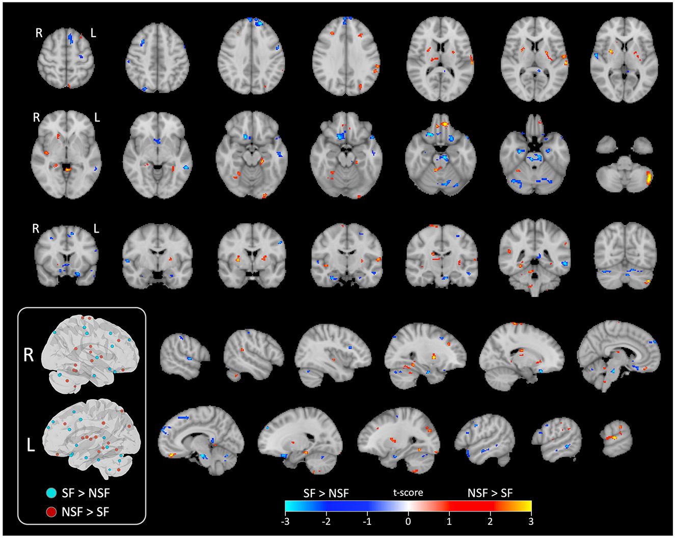 Rows of brain MRI scans display different brain slices with color-coded areas indicating t-scores. A legend shows blue for SF greater than NSF and red for NSF greater than SF. The images highlight differences in brain activity.