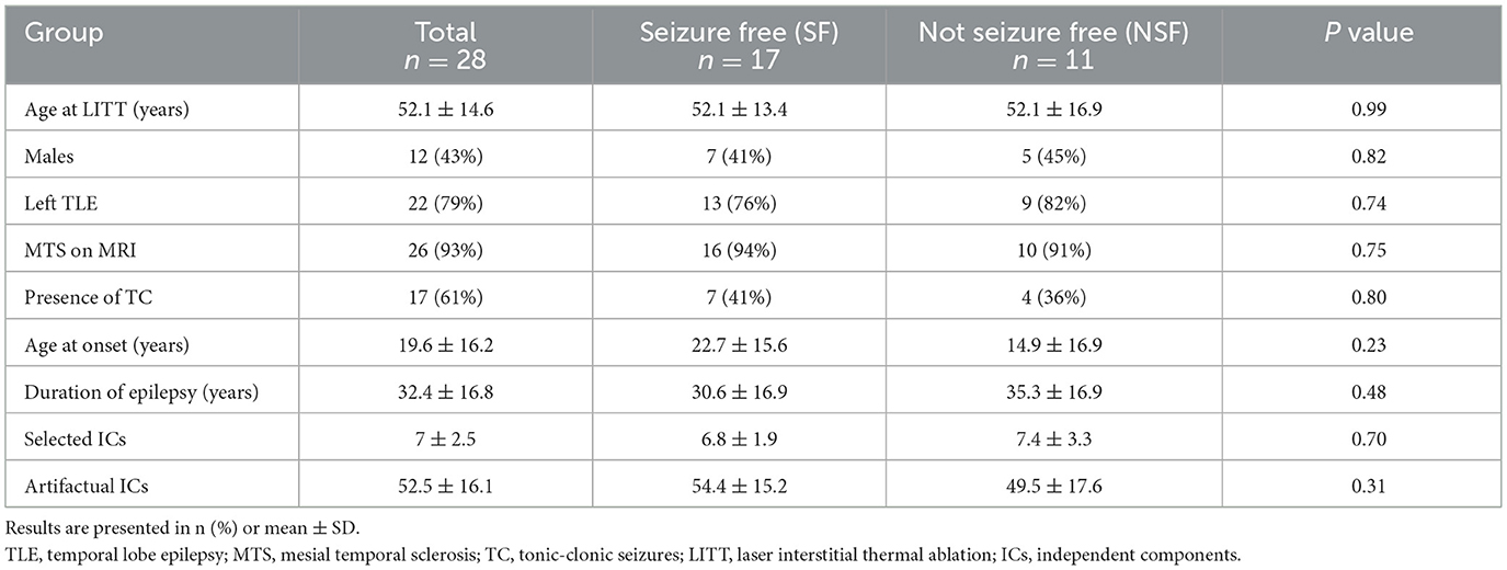 A total of 28 patients met our inclusion criteria. At the 1-year post-operative follow-up, 17 (60.7%) patients achieved seizure freedom (Engel Class Ia and Ib) and were included in the SF group, while 11 (39.3%) patients were classified as the NSF group. There were no significant differences between the SF and NSF groups regarding patients' age at procedure, gender, side of TLE, presence of MTS on MRI, presence of pre-operative TC seizures, age at epilepsy onset, and duration of epilepsy. Manual IC selections after single-session ICA identified a mean of seven meaningful ICs (SD = 2.5) and 52.5 artifactual ICs (SD = 16.1) per patient. No significant differences were found between the SF and NSF groups regarding the number of selected and artifactual ICs. Patient demographics, clinical characteristics, and the number of ICs after manual selection are summarized in Table 1.