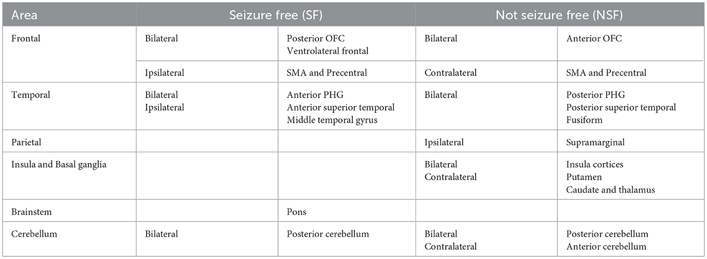 Overall, SF group demonstrated more localized FC patterns, primarily in ipsilateral mesial temporal and frontal regions, whereas NSF group showed more diffuse and contralateral FC, involving temporal, frontal, insular, subcortical and cerebellar regions (Table 2).