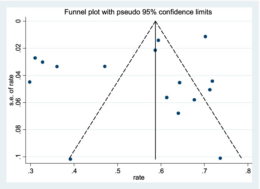 Statistical analysis was performed using Stata 13.0 software. Measurement data were expressed as standardized mean difference (SMD) and weighted mean difference (WMD). The proportion of poor sleep quality measured in all included studies was extracted. Before pooling prevalence estimates, the variance of the raw prevalence from each included study was stabilized by using the Freeman-Tukey double arc-sine transformation (24). When the number of studies included was less than five, a fixed-effects model was used. When the number of studies included was greater than or equal to five, heterogeneity among study outcomes was first assessed (25). In cases where p > 0.1 and I2 < 50%, a fixed-effects model was applied; however, when p ≤ 0.1 or I2 ≥ 50%, indicating high heterogeneity, a random-effects model was used.