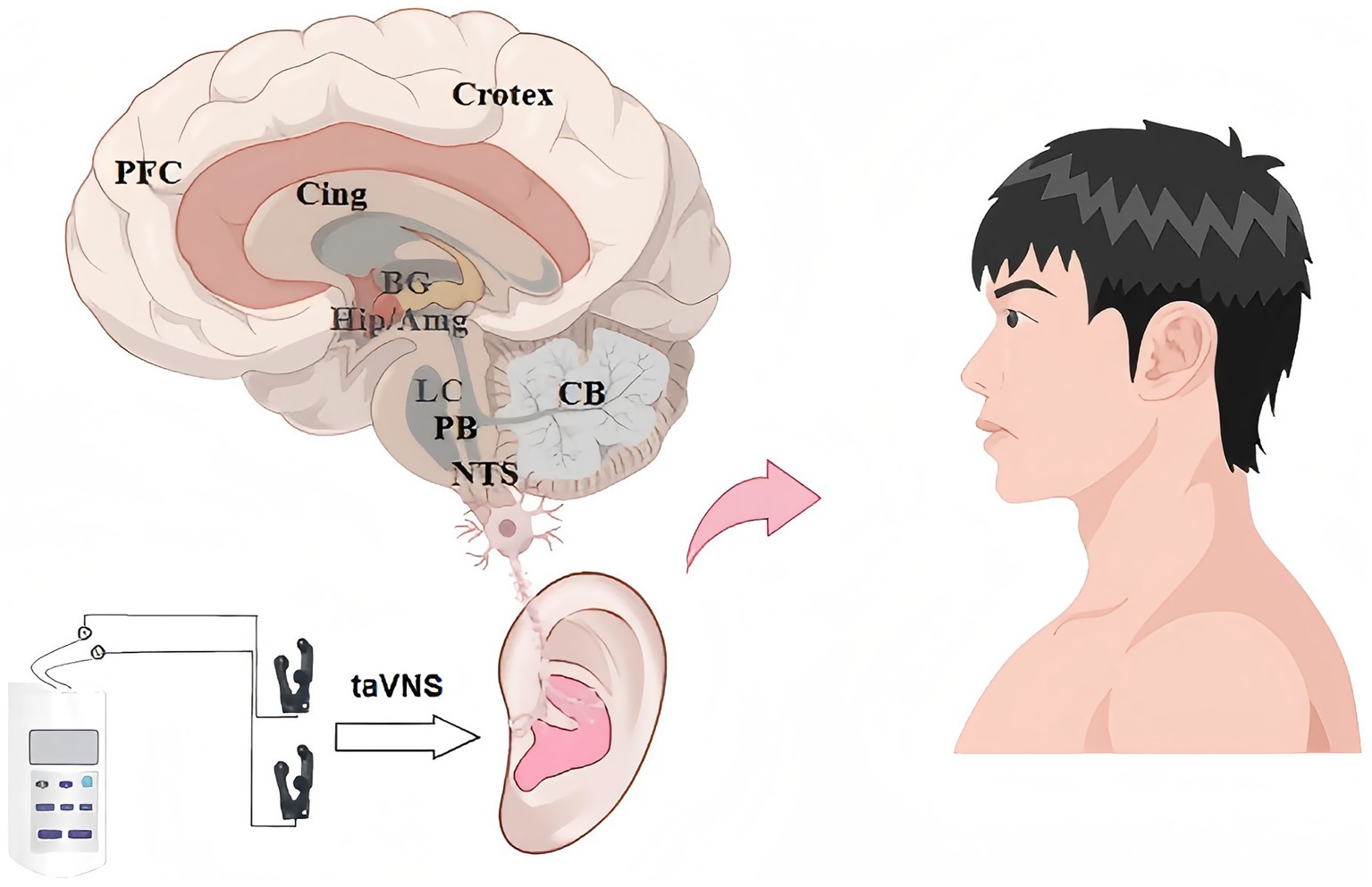 In recent years, transcutaneous auricular vagus nerve stimulation (taVNS) has emerged as a promising non-invasive neuromodulation technique, attracting growing interest in both clinical and research applications. Compared to conventional invasive VNS, taVNS offers significant advantages: by selectively stimulating the auricular branch of the vagus nerve (ABVN)—the only superficially accessible vagal branch—it can directly activate both the NTS and dorsal motor nucleus (DMN) in the medulla, thereby establishing a complete “peripheral stimulation–central response” neural reflex circuit (15, 16); additionally, its completely non-invasive nature not only improves patient compliance but also eliminates the risks associated with surgical implantation, making it a safer and more sustainable option for long-term neuromodulation therapy (17).