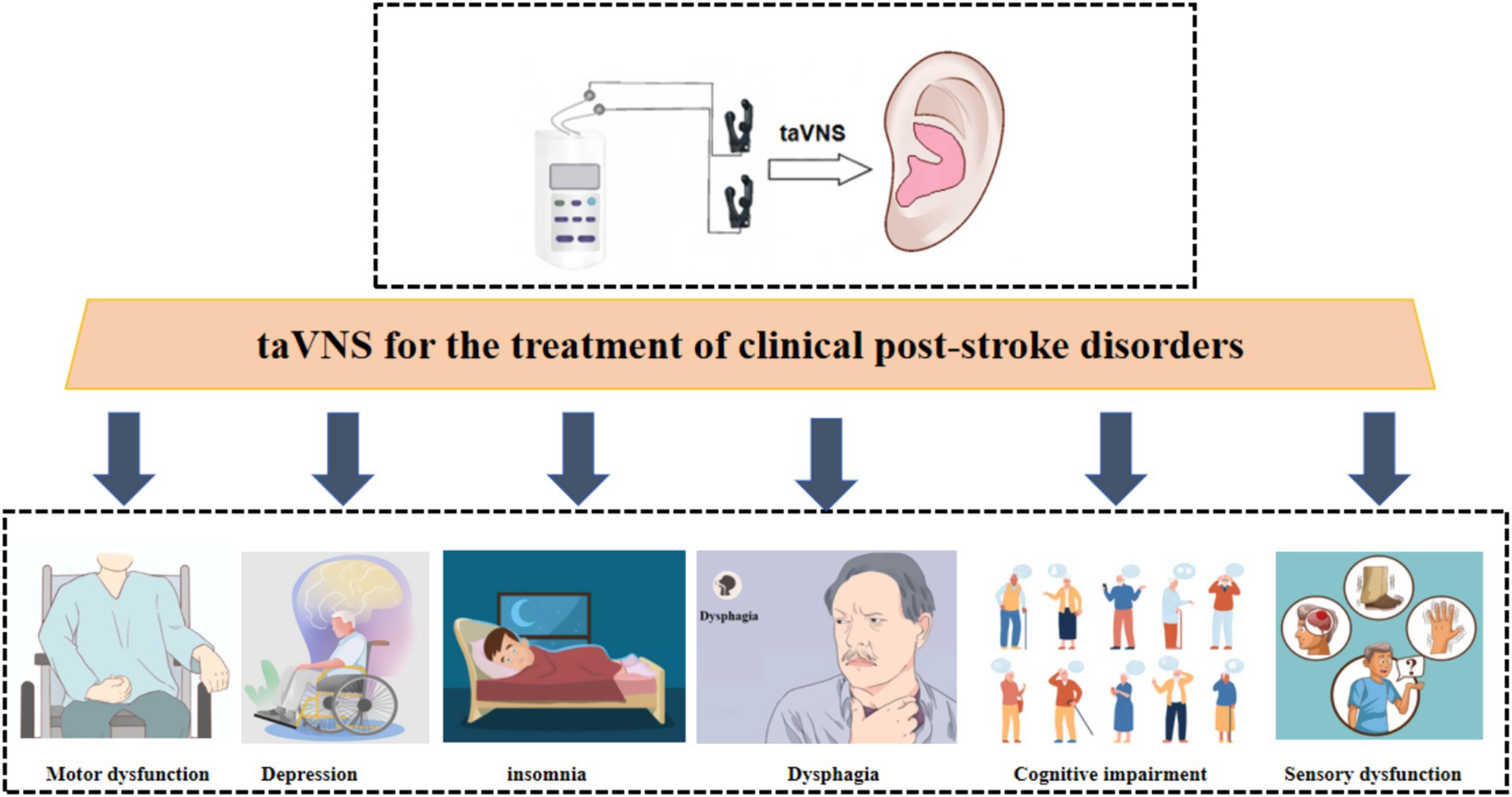 Figure 2. This figure summarizes various post-stroke functional deficits that have been explored in clinical studies and are potentially amenable to taVNS therapy, including motor dysfunction, depression, insomnia, dysphagia, cognitive impairment, and sensory dysfunction.