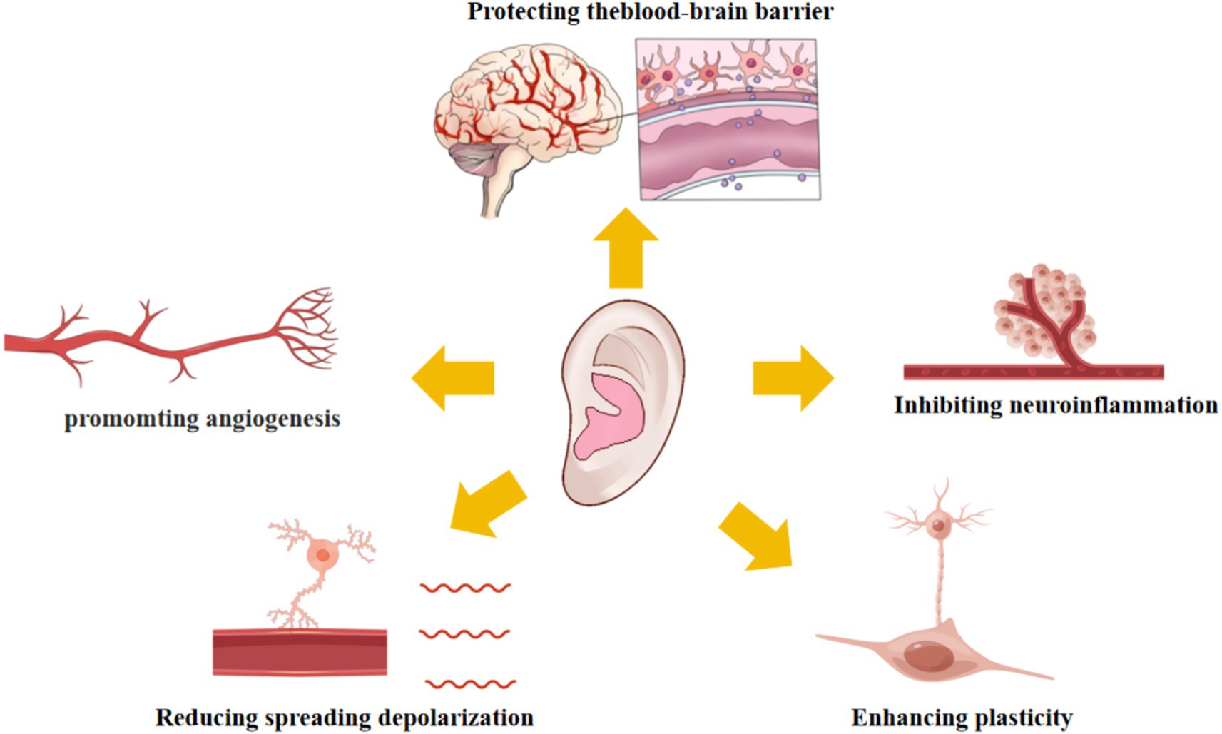 A recent study investigated the therapeutic mechanism of taVNS in post-stroke recovery (55). The research revealed that in a mouse model of stroke, taVNS activates α7nAChR, leading to upregulation of GPX4 and downregulation of ACSL4 expression. Concurrently, this stimulation promoted neurogenesis and angiogenesis while reducing neuroinflammation. Another study demonstrated that taVNS significantly improved neurological deficit scores, balance capacity, and sensorimotor function (56). The therapeutic effects were mediated through upregulation of brain-derived neurotrophic factor (BDNF), phosphorylated endothelial nitric oxide synthase (p-eNOS), and vascular endothelial growth factor (VEGF) expression, which enhanced angiogenesis and endothelial cell proliferation in the ischemic penumbra. In addition, Long et al. (54) found that taVNS promotes angiogenesis in the white matter region by increasing the expression of VEGF and basic fibroblast growth factor (FGF2).