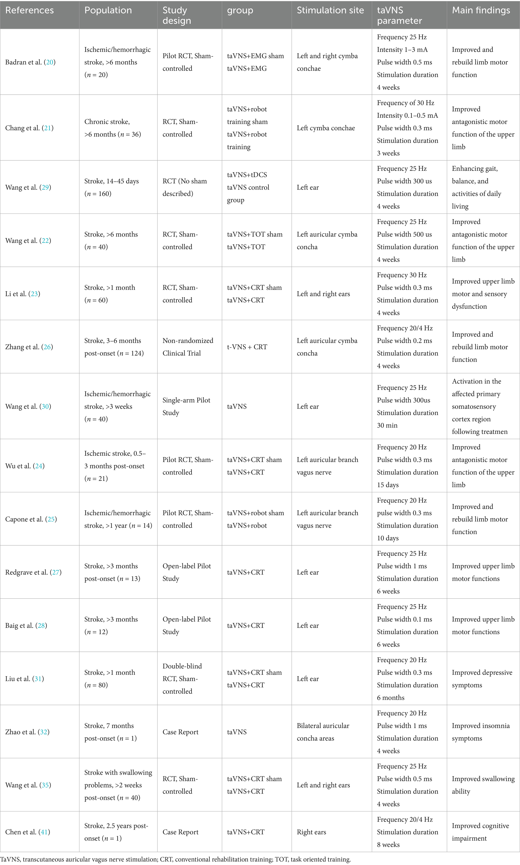 Post-stroke limb motor dysfunction is a prevalent and debilitating condition that severely impacts patients’ functional independence and quality of life. Our systematic review of 13 clinical studies demonstrates strong evidence for the efficacy taVNS in motor rehabilitation (Table 1). Multiple randomized controlled trials utilizing sham-controlled designs (20–25) have confirmed the therapeutic benefits of taVNS, particularly when combined with conventional rehabilitation (23, 24, 26–28) or robotic training (21, 25). Notably, Li et al. (23) reported significantly greater motor improvement when taVNS was integrated with standard rehabilitation compared to control groups.