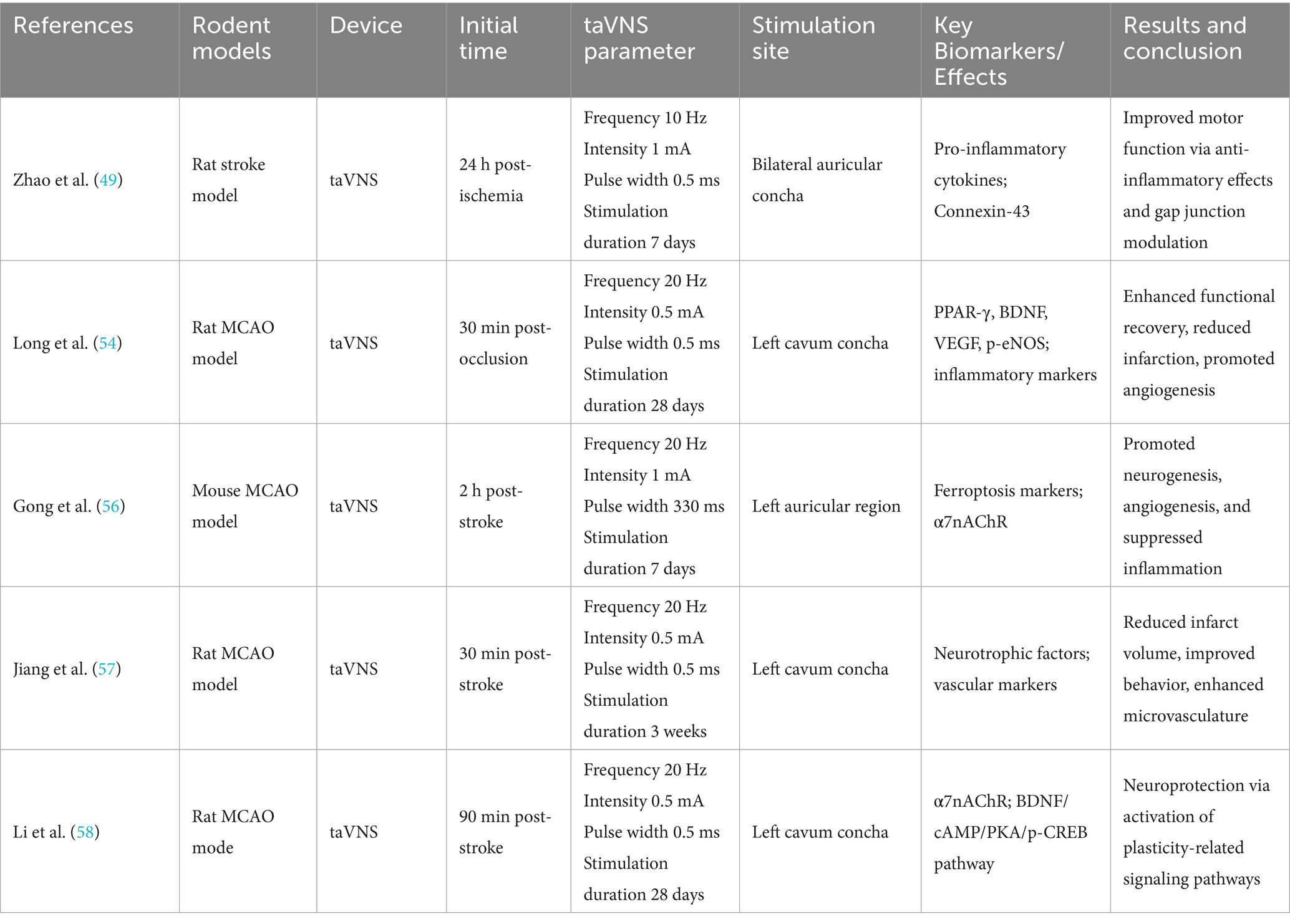 Although animal studies have established that taVNS confers neuroprotection via cholinergic anti-inflammatory pathways, neurovascular remodeling, and synaptic plasticity mechanisms, a significant translational gap remains between these preclinical findings and clinical application. Current mechanistic research faces three major limitations. First, there are pathophysiological differences between standard animal models of stroke and human cerebrovascular disease, particularly in the complexity of cortico-striatal circuits, which may differentially influence taVNS responsiveness (68). Second, although some studies have explored the effects of taVNS on biomarkers such as heart rate variability, TMS parameters, pupillometry, neuroimaging, and event-related cortical potentials, research focused specifically on stroke populations remains relatively limited. Third, the relationship between stimulation parameters and underlying mechanisms remains unclear. Different frequencies may engage distinct neural circuits, yet no established correlations link specific parameters to their target pathways. This mechanistic fragmentation considerably hinders the development of precision therapies. Fourth, mechanisms such as anti-inflammatory effects, angiogenesis, and blood–brain barrier protection currently rely primarily on preclinical evidence for support. Although these mechanisms have been thoroughly validated in animal models (49, 54, 56), confirmatory human biomarker data remain considerably limited. For instance, while reductions in pro-inflammatory cytokine levels have been observed in human studies of non-stroke conditions (46), such evidence remains scarce in stroke populations. Similarly, angiogenesis and blood–brain barrier integrity have predominantly been demonstrated in rodent models (54, 57, 68), with no direct validation via imaging or biomarkers in human trials to date.