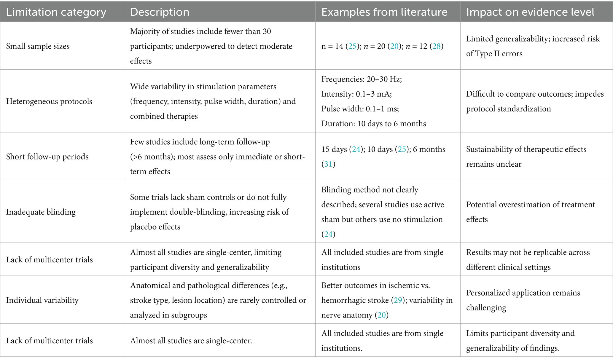 Current clinical studies on taVNS exhibit significant design limitations, primarily manifested in small sample sizes, short follow-up durations, inadequate blinding methodologies, and a lack of multicenter trials (Table 3). Most clinical trials to date have been limited by small sample sizes, which substantially reduces statistical power and generalizability of findings. For instance, while the study by Liu et al. included 80 participants, many others enrolled only 12–20 individuals, making it difficult to draw firm conclusions about efficacy (31). This insufficient statistical power makes it difficult to generalize conclusions. Additionally, some trials lack sham stimulation control groups or fail to implement double-blinding, making them susceptible to placebo effects. For example, although Wu et al.’s study adopted a randomized controlled design, it did not clearly describe blinding procedures, potentially compromising the reliability of results (24). Future research should conduct multicenter, large-scale randomized controlled trials with follow-up periods extending beyond 1 year to comprehensively evaluate the long-term efficacy and safety of taVNS. Moreover, strict adherence to CONSORT guidelines is essential to improve blinding methods and control group designs, ensuring the scientific validity and reliability of study outcomes.
