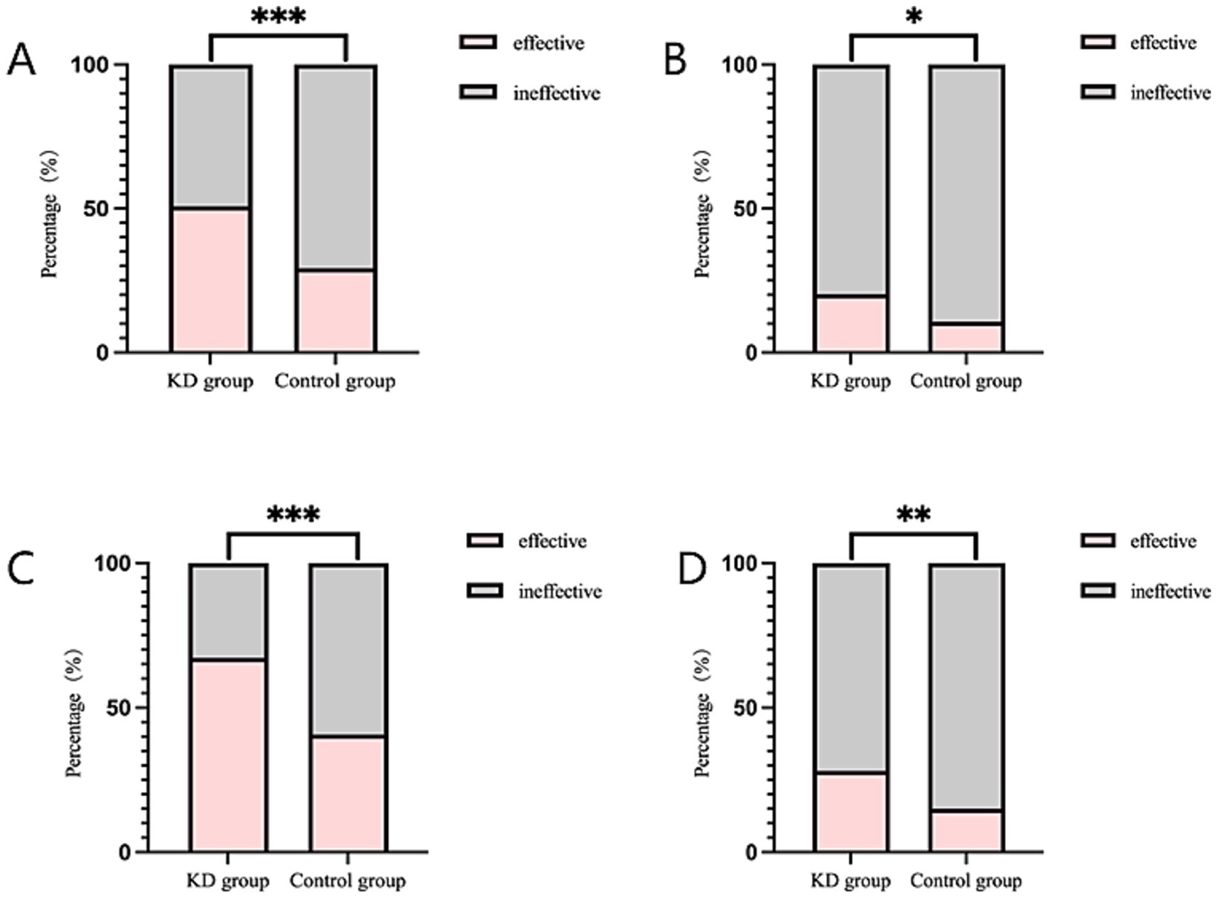 Figure 1. Comparison of seizure response rate and seizure-free rate between the two groups. (A) Seizure response rate in 6-month following up. (B) Seizure-free rate in 6-month following up. (C) Seizure response rate in 3-month following up. (D) Seizure-free rate in 3-month following up. *indicates p < 0.05; **indicates p < 0.01; ***indicates p < 0.001.