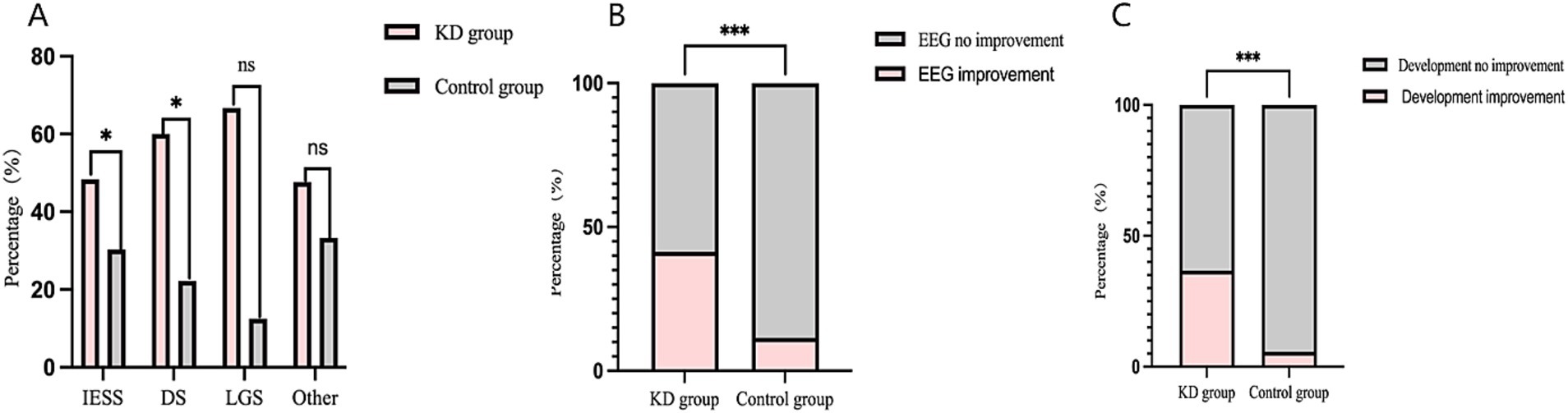 Figure 2. (A) Comparison of seizure response rate in different epilepsy syndromes between the two groups in 6-month following up. (B) Comparison of EEG improvement rate in between the two groups in 6-months following up. (C) Comparison of rate in developmental improvement rate between the two groups in 6-months following up. *indicates p < 0.05; **indicates p < 0.01; ***indicates p < 0.001.