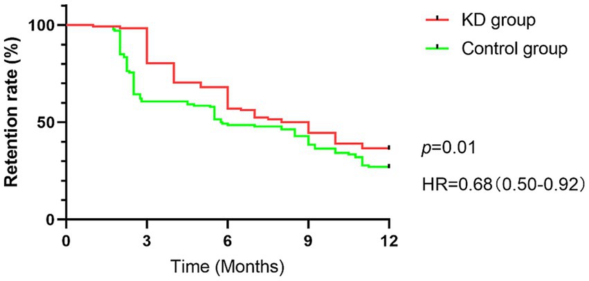 The median retention time was 8.50 months in the KD group and 5.78 months in the control group. Survival analysis showed that retention rate in KD group was better than that in control group at any point during one-year following up (HR = 0.68, 95%CI 0.50–0.92), with statistically significant difference (p = 0.01) (Figure 3).