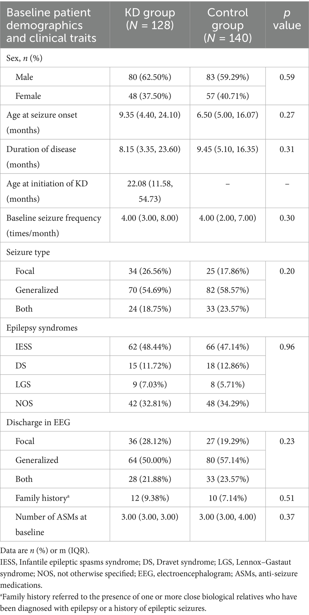 From January 2021 to January 2024, a total of 296 children were started on the KD at our institution. Of those patients, 18 patients from the KD group who persist in KD treatment for less than 6 months and 10 patients from the control group who were lost to follow-up were excluded. Finally, the remaining 268 patients, of whose 128 in the KD group and 140 in the control group, were included in our study. The baseline demographic data and clinical details of our cohort are listed in Table 1. No statistically significant difference between the two groups was found (p > 0.05). In addition, among 61 patients with obtaining genetic information in KD group, 25 patients have specific pathogenic gene variants, including SCN1A in ten cases, MECP2 in three cases, deletion in three cases, SCN2A in two cases, DEPDC5 in two cases, KCNT1 in one case, CDKL5 in one case, STXBP1 in one case, DYNC1H1 in one case, KCNQ1 in one case. In control group, among 52 patients with obtaining genetic information, 11 patients have specific pathogenic gene variants, including SCN1A in two cases, NF1 in two cases, SCN2A in one case, GABRB3 in one case, NALCN in one case DMN1 in one case, GATA5 in one case, TSC2 in one case, and deletion in one case. Given that the above genetic data was scattered and could not be subjected to statistical analysis, we did not present it in the Table 1.