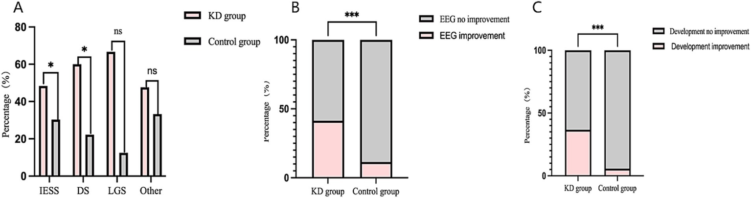 (A) Comparison of seizure response rate in different epilepsy syndromes between the two groups in 6-month following up. (B) Comparison of EEG improvement rate in between the two groups in 6-months following up. (C) Comparison of rate in developmental improvement rate between the two groups in 6-months following up. *indicates p < 0.05; **indicates p < 0.01; ***indicates p < 0.001.