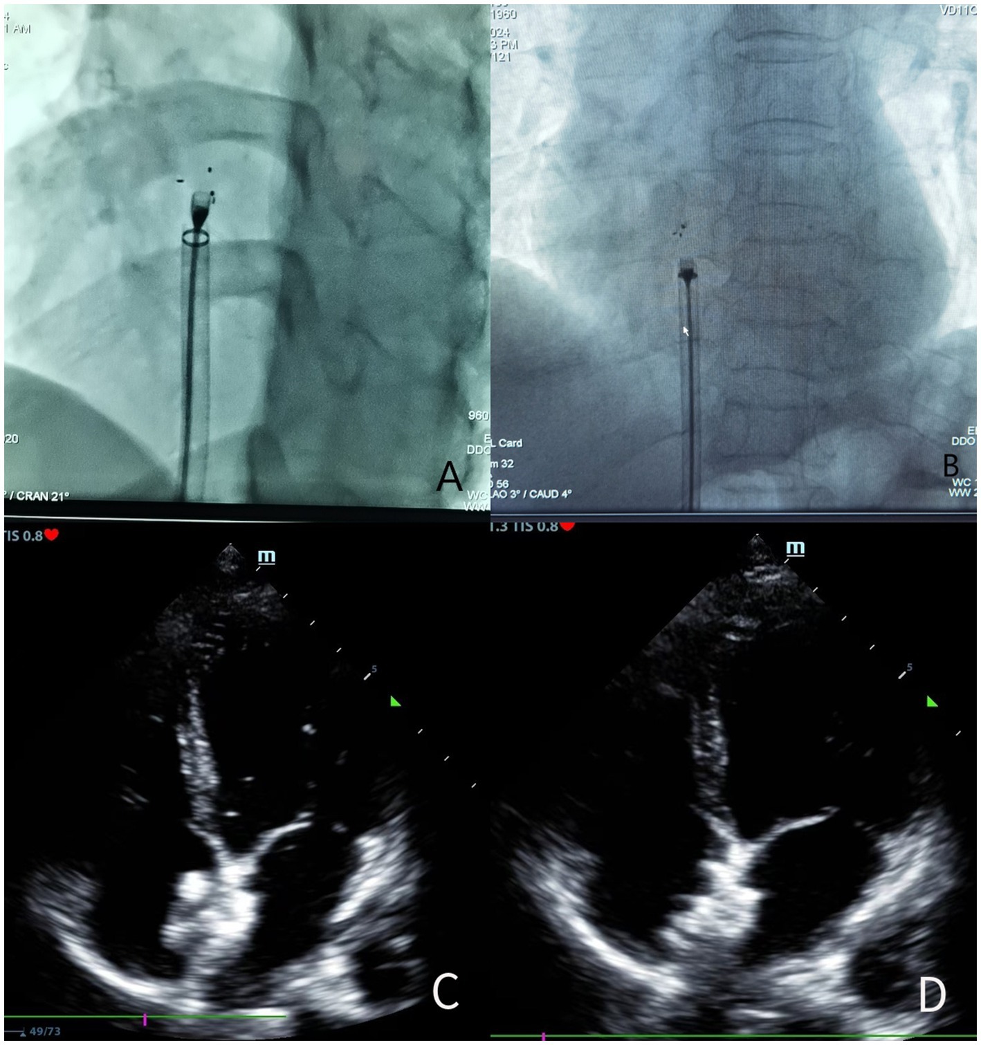 Figure 1. (A) Before the release of the biodegradable occluder under the X-ray line; (B) After the release of the biodegradable occluder under the X-ray line; (C) Before the release of the biodegradable occluder by TTE during the operation; (D) After the release of the biodegradable occluder by TTE during the operation.