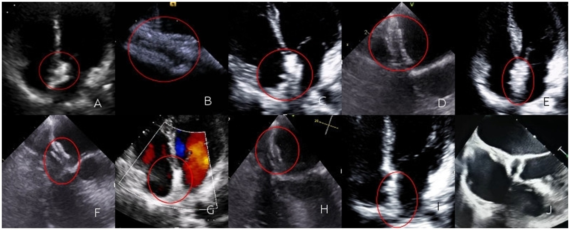 Figure 2. (A) Immediately after the operation, TTE revealed three layers of interlayers in the contour of the occluder. The occluder was highlighted and moved synchronously with the atrial septum; (B) Immediately after the operation, a circular contour of the left disc could be seen by TEE; (C) One month after the operation, TTE revealed three layers of interlayers in the contour of the occluder. The occluder was highlighted and moved synchronously with the atrial septum; (D) One month after the operation, a circular contour of the left disc could be seen by TEE; (E) Three months after the operation, TTE revealed three layers of interlayers in the contour of the occluder. The occluder was highlighted and moved synchronously with the atrial septum; (F) Three months after the operation, a circular contour of the left disc could be seen by TEE; (G) Six months after the operation, TTE revealed the occlude was highlighted, the contour of the occluder was blurred, the three-layer dissection structure gradually became blurred, and it moved synchronously with the atrial septum; (H) Six months after the operation, a circular contour of the left disc could be seen by TEE, the occluder gradually degrades; (I) One year after the operation, the TTE was not clear enough, and the three layers of interlayers could not be observed; (J) One year after the operation, TEE revealed regenerated tissue in the form of the occluder. The regenerated tissue faintly formed a three-layer interlayer with the atrial septum.