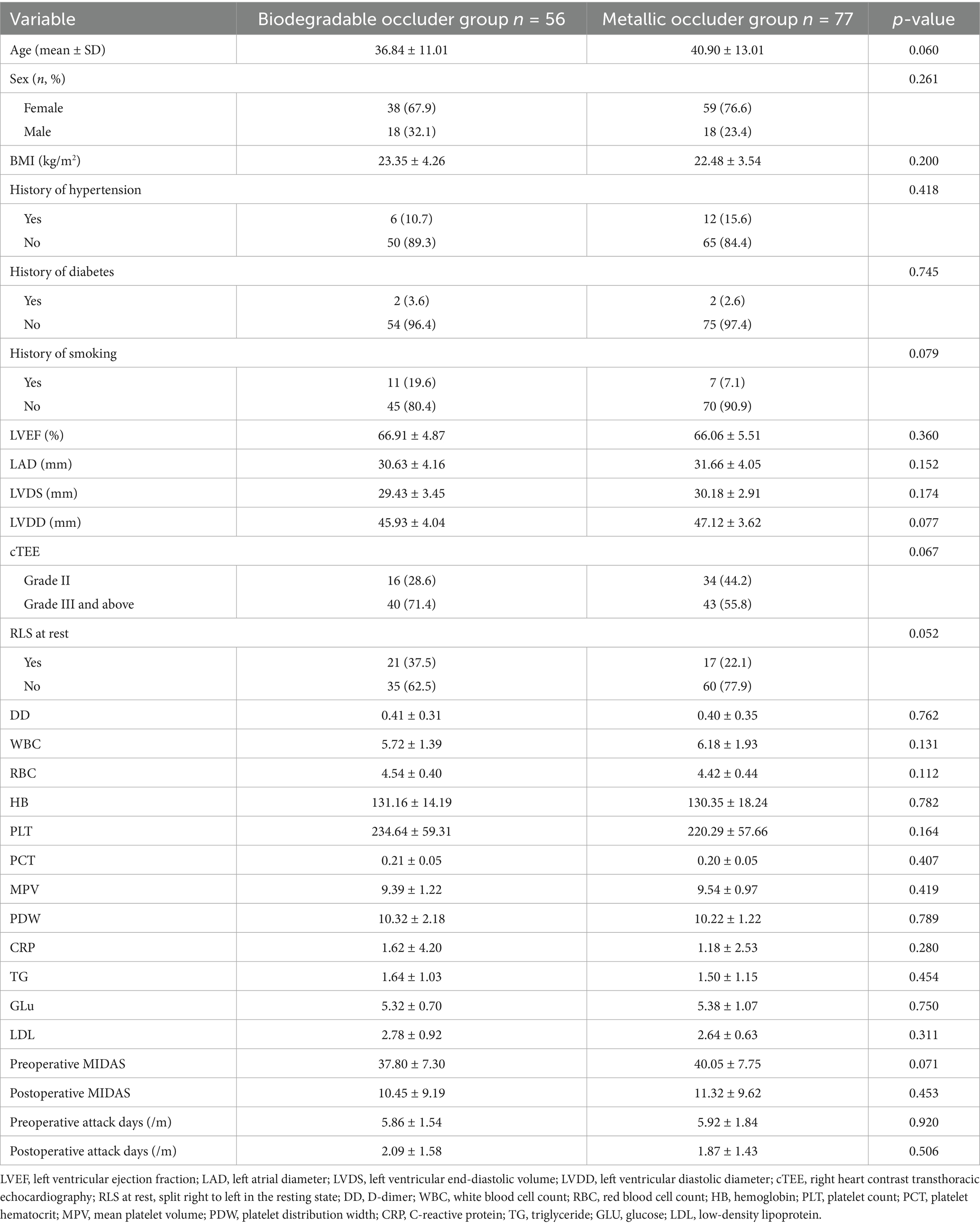 A total of 145 patients were enrolled before the operation. 60 patients were included in the biodegradable occluder group, and 85 patients were included in the metallic occluder group. Among them, 1 patient in the biodegradable occluder group gave up the operation before the operation, and the follow-up of 3 patients was lost. In the metallic occluder group, 2 patients had pericardial tamponade during the operation, 1 patient gave up the operation due to the inability of the guidewire to pass, and the follow-up of 5 patients was lost. Therefore, a total of 133 patients successfully had the occluder implanted and completed the follow-up. Among them, biodegradable occluders were successfully implanted in 56 patients, and metallic occluders were successfully implanted in 77 patients. Table 1 shows the corresponding basic information of the enrolled patients. There were no significant differences between the two groups in terms of age, gender, BMI, hypertension, diabetes, smoking, echocardiography, and hematological indicators. The preoperative MIDAS score and the number of attack days per month were similar and matched (p > 0.05, Table 1).
