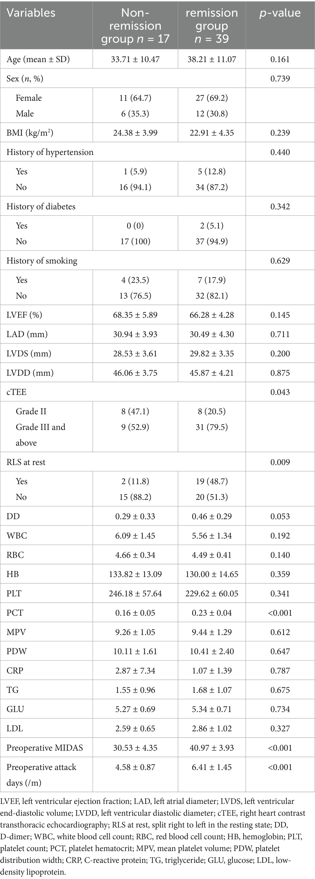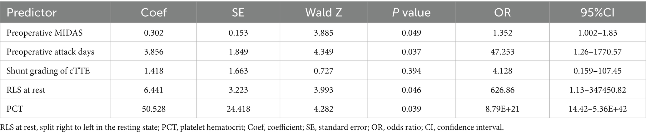 The biodegradable occluder group was divided into the remission group and the non-remission group according to whether migraine improved one year after surgery. By comparing the preoperative baseline data of the two groups, it was found that there were differences between the two groups in preoperative MIDAS scores, the number of attack days per month before surgery, shunt grading of cTTE, whether there was RLS at rest, and PCT. When the above indicators were included in the multivariate logistic regression analysis, it was found that preoperative MIDAS scores (p = 0.049), the number of attack days per month before surgery (p = 0.037), the presence of RLS at rest (p = 0.046), and PCT (p = 0.039) were independent risk factors for postoperative migraine relief in patients of the biodegradable occluder group (Tables 2, 3).