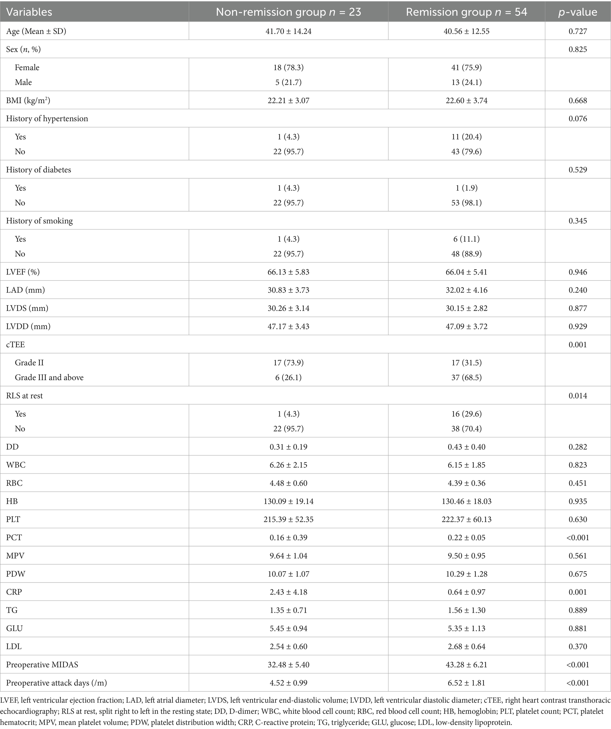 Previous related studies have also found that, on the basis of fully selecting patients, there are still some patients whose migraine does not improve significantly after PFO closure. Wang (31) and Zhao (18) respectively conducted multivariate correlation analyses on whether migraine was relieved after metallic occluder implantation and established a nomogram model to predict the predictive factors affecting migraine relief after PFO closure. However, the above studies were all focused on metallic occluders. Then, what are the factors affecting biodegradable occluders, and are there any differences from metallic occluders?