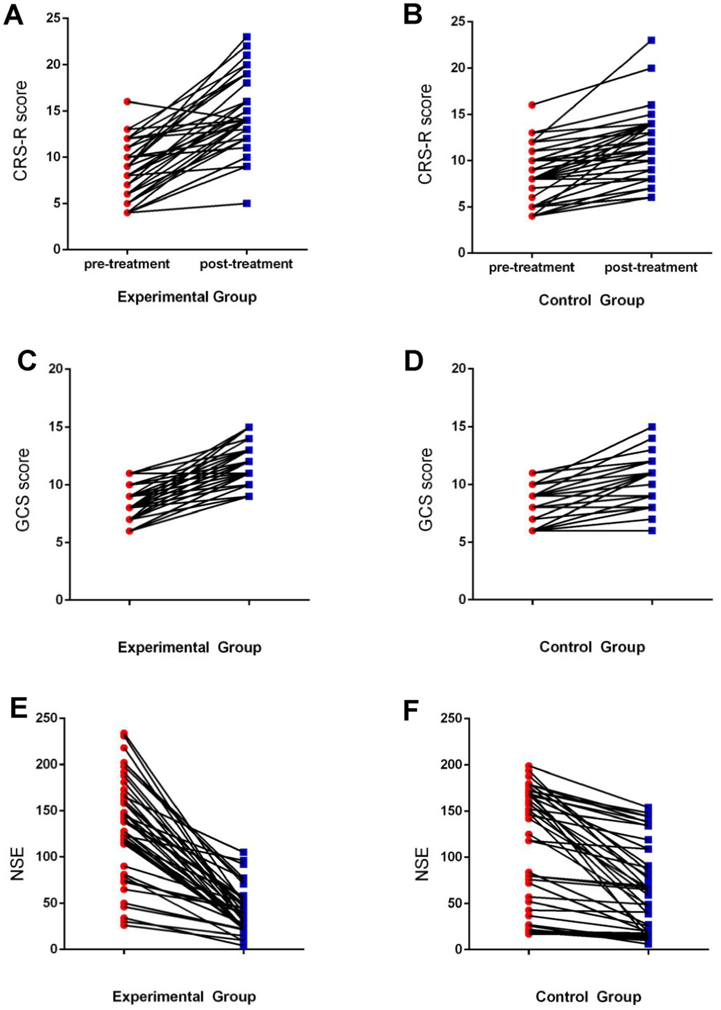 Table 2. Changes in CRS-R score, GCS score and NSE level after treatment in the experimental and control groups.