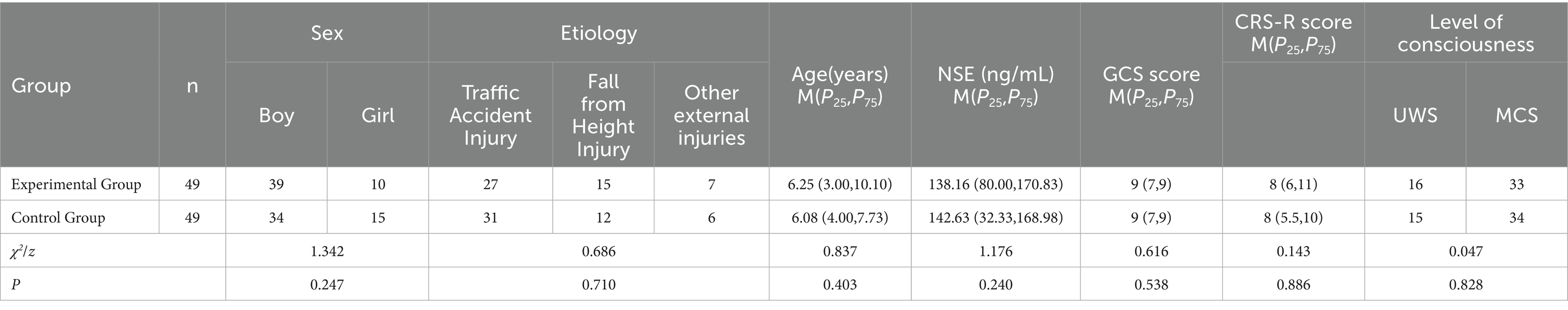 Ninety-eight pediatric patients with DOC following TBI admitted to Kunming Children’s Hospital from January 2023 to July 2025 were enrolled in this study (approved by the Institutional Review Board of our hospital, with written informed consent obtained from their legal guardians). Participants were randomly divided into a control group and an experimental group, with 49 cases in each group. No significant differences were observed in baseline characteristics between the two groups, including sex, age, etiology of TBI, serum NSE level (normal range: 0–15.7 ng/mL), GCS score, CRS-R score, and level of consciousness (all p > 0.05) as shown in Table 1.