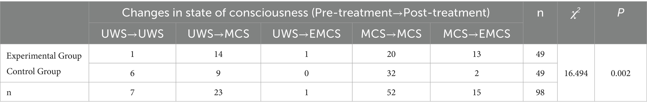 As shown in Tables 1, 3, in the experimental group, 16 patients were in a state of unresponsive wakefulness syndrome (UWS) before treatment. After treatment, 14 of these patients transitioned to a minimally conscious state (MCS), and one patient improved to emergence from MCS (EMCS). In the control group, 15 patients were in UWS before treatment, of whom 9 transitioned to MCS after treatment. Before treatment, 33 patients in the experimental group were in MCS. After treatment, 13 of these patients improved to EMCS. In the control group, 34 patients began in MCS, and only 2 transitioned to EMCS after treatment. Significantly more patients in the experimental group showed improvement in their level of consciousness compared to the control group (p = 0.002).
