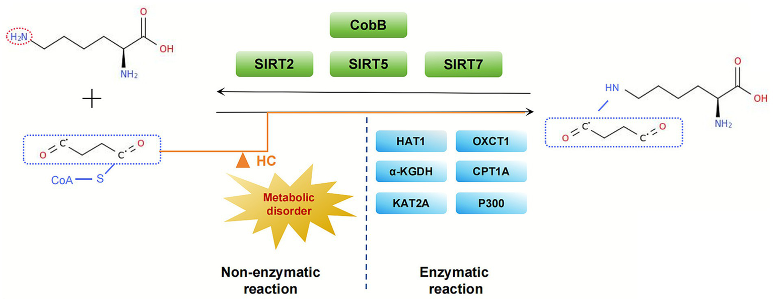 Lysine succinylation, a type of PTM, is defined as the covalent linkage of succinyl groups to the lysine residues of substrate proteins through donors. In comparison with methylation and acetylation, succinylation modifications introduce larger, negatively charged functional groups, thereby more significantly altering protein conformation and functional properties. Recent studies have substantiated the existence of a dual-drive mechanism for succinylation, encompassing both enzymatic catalysis and non-enzymatic reactions.