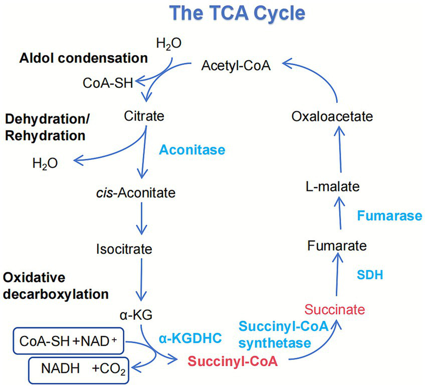 The TCA cycle is the central metabolic hub within eukaryotic mitochondria. It serves as the ultimate common pathway for the oxidation of carbohydrates, proteins, and lipids. It plays a vital role in key biological processes such as gluconeogenesis, amino acid metabolism, and lipid synthesis (26). Within this cycle, isocitrate is catalyzed by isocitrate dehydrogenase (IDH) to produce α-KG and NADH. α-KG is subsequently converted to succinyl-CoA and releases NADH through oxidative decarboxylation by the α-KGDH (27). Subsequently, succinyl-CoA undergoes substrate-level phosphorylation by succinyl-CoA synthetase to form succinate.