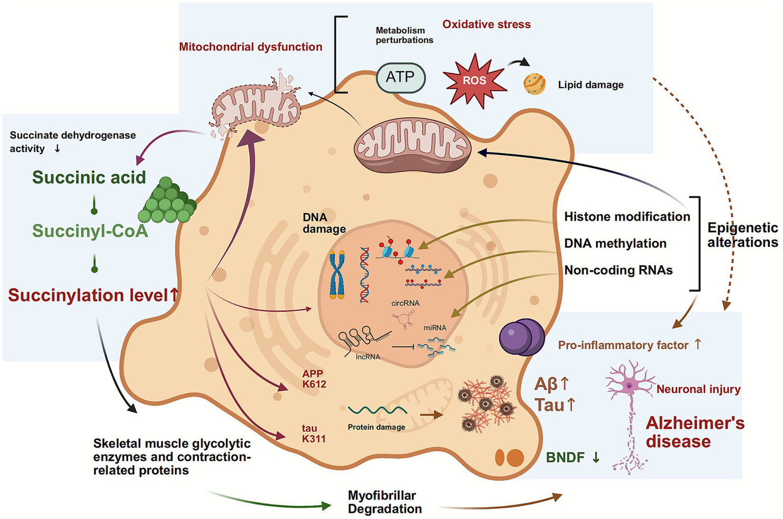 These findings prompt the following considerations: The present study hypothesises that succinylation constitutes a molecular hinge between metabolic homeostasis and epigenetic regulation, driving neurodegenerative cascades by establishing bidirectional signalling networks. Current evidence indicates that metabolic microenvironmental disturbances – such as abnormalities in the TCA cycle, impaired glycolysis, and disrupted electron transport chains – can alter succinyl-CoA concentrations, thereby influencing succinylation levels (17). Conversely, histone succinylation (e.g., H3K79succ) has been demonstrated to regulate nucleosome stability and chromatin dynamics (19). This finding suggests that succinylation does not merely passively respond to metabolic fluctuations, but also actively contributes to the reshaping of the epigenetic landscape, thereby establishing bidirectional regulatory circuits. However, extant studies predominantly focus on the unidirectional regulatory effects of succinylation, lacking systematic analysis of its integration mechanisms within metabolic-epigenetic interaction networks. This review proposes the succinylation bidirectional regulatory network hypothesis: in the process of neurodegenerative disease, energy metabolism abnormalities regulate succinylation levels by altering metabolic flux, inducing functional modifications to neuronal proteins. These changes make neural decline worse by disrupting synaptic plasticity, mitochondrial quality control, and epigenetic reprogramming. Abnormal DNA methylation and dysregulation of non-coding RNA form a pathological cycle regulating the expression of metabolism-related genes (Figure 1).
