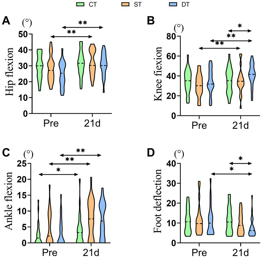 Distribution of lower extremity kinematic parameters across groups before and after iTBS intervention. (A) Hip Flexion (°), (B) Knee Flexion (°), (C) Ankle Flexion (°), and (D) Foot Deflection (°) at pre and after 21 days of intervention. Statistical annotations: *p < 0.05, **p < 0.01 (paired-sample t-test for within-group comparisons; one-way ANOVA with Bonferroni post hoc test for between-group comparisons).