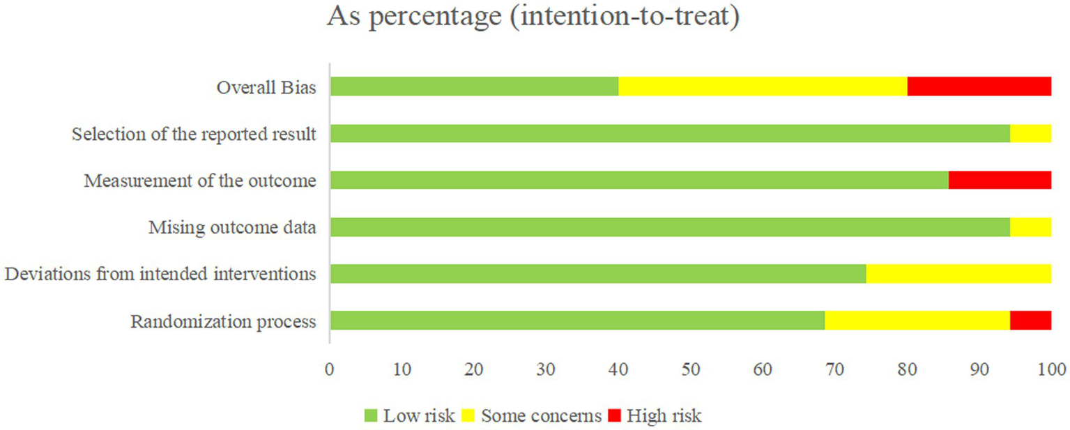 Two investigators (LX and MHD) independently reviewed all articles and extracted data. The extracted content included basic information of each study (first author, publication year, and country), participant characteristics (post-stroke recovery phase, age, and sample size), intervention characteristics (interventions and duration), and outcome measures (6MWD, 10MWT, BI, and FMA). In the event of discrepancies during the data extraction, a third investigator (LWC) would join the discussion and assist in making the decision. Two investigators (LX and MHD) applied the second version of the risk of bias tool (ROB2) to evaluate the included articles in the following domains: (1) bias arising from the randomization process; (2) bias due to deviations from the intended interventions; (3) bias from missing outcome data; (4) bias in outcome measurement; (5) selective reporting bias in result (27). The risk of bias (ROB) was classified into three categories: low ROB, high ROB, and unclear. The evaluation process was conducted independently by two investigators. In the event of any disputes arising during the assessment, a third investigator (LWC) would be consulted to reach a consensus.