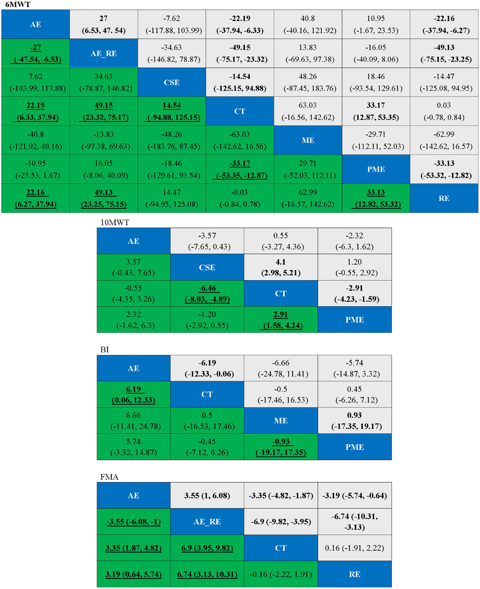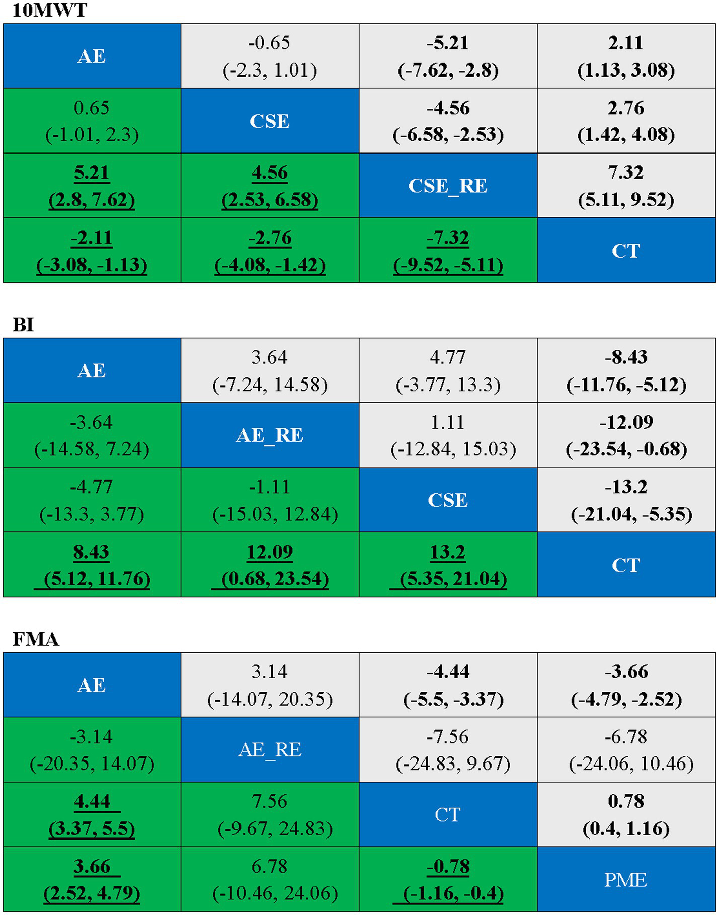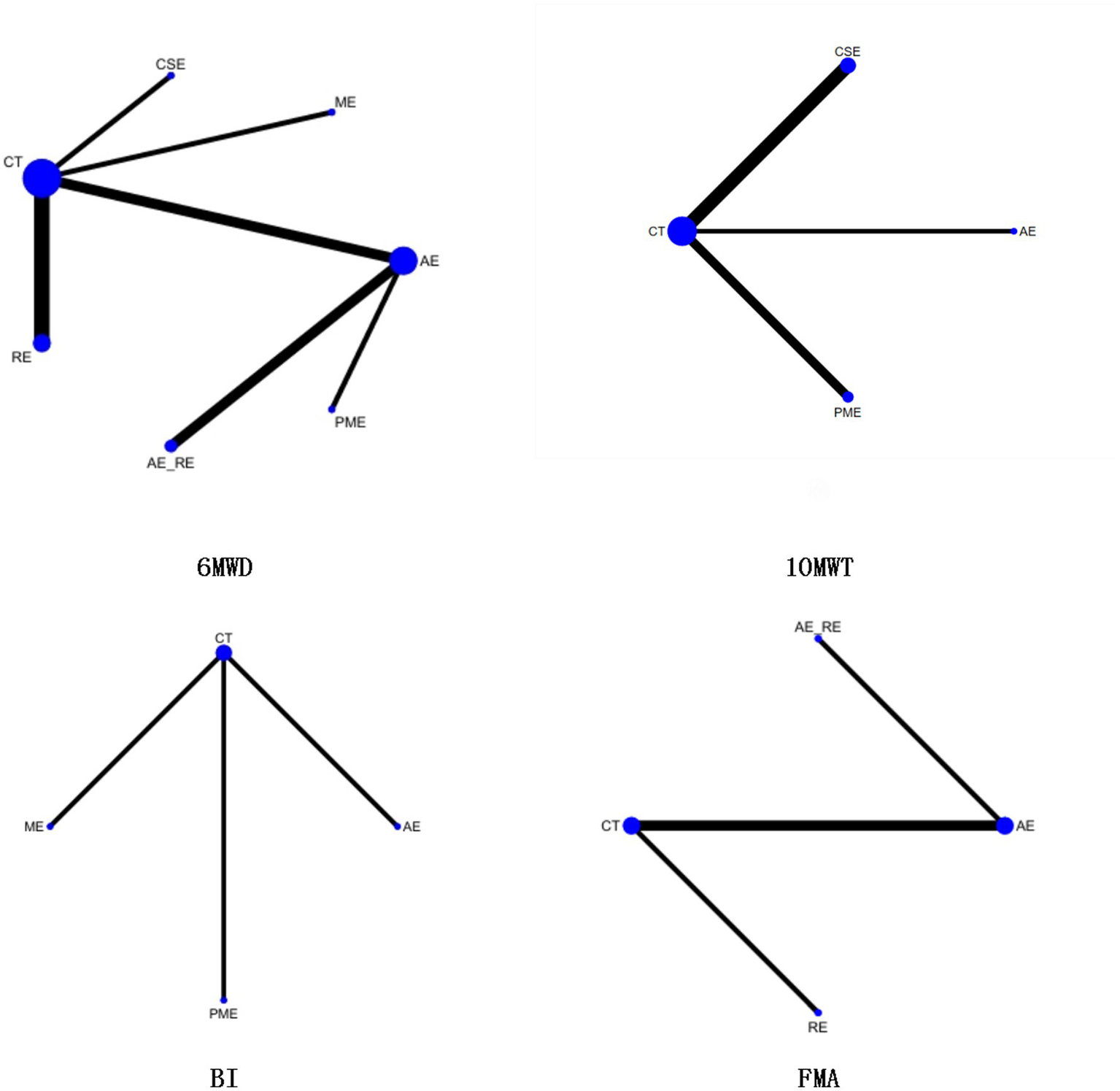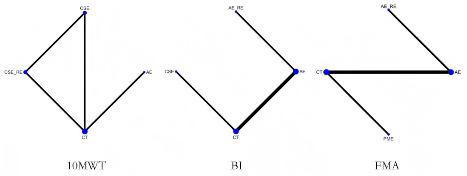 To explore the influence of potential effect modifiers on the intervention outcomes, we performed meta-regression analyses. These analyses were conducted to examine whether patient age and intervention duration significantly moderate the treatment effects of various exercise interventions compared to conventional therapy (CT). Separate regression models were developed for each of the four primary outcome measures: 6MWD, 10MWT, BI, and FMA. Using comparison type (e.g., AE vs. CT) as the unit of analysis, we incorporated age (defined as the mean age of the study sample) and intervention duration (in weeks) as continuous covariates into a Bayesian random-effects model. The results are presented as regression coefficients (β) along with their 95% credible intervals (CrI). The β coefficient represents the change in the mean difference (MD) of the outcome measure associated with a one-unit increase in age or intervention duration. Additionally, we reported the I2 statistic for the model residuals to quantify the proportion of residual heterogeneity not explained by the covariates.