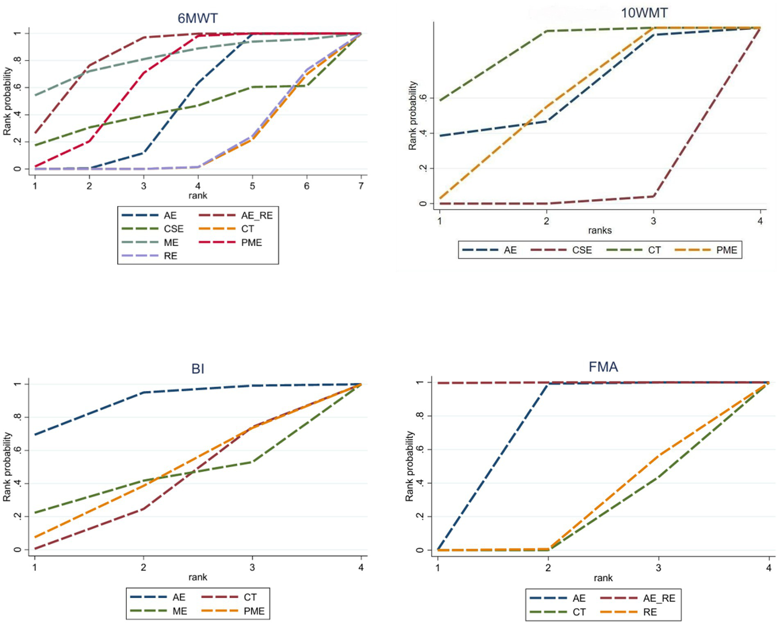 To evaluate the quality of evidence for the results of this network meta-analysis, we applied the GRADE approach using the CINeMA framework for the four primary outcomes: the 6-Minute Walk Test, the 10-Meter Walk Test, the Barthel Index, and the Fugl-Meyer Assessment. This framework evaluates evidence across six domains: risk of bias, publication bias, indirectness, imprecision, heterogeneity, and incoherence. Based on a comprehensive evaluation of these domains for each comparison, the quality of evidence was categorized into one of four grades: high, moderate, low, or very low.