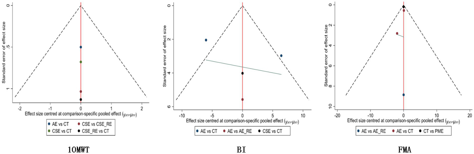 For the other outcome measures mean difference (MD) was employed as the effect size, accompanied by a corresponding 95% credible interval (CI). According to the methods outlined in section 16.1.3.2 of the Cochrane Handbook version 5.0.2, the mean change and standard deviation before and after treatment were calculated. The extracted data were then analyzed using R version 4.4.1 and Stata version 15.0 software. Given the heterogeneity among the trials, a Bayesian hierarchical random-effects model was first used to analyze the multiple comparisons of different exercise interventions in stroke treatment (29, 30). All calculations and graphics were performed utilizing R 4.4.1 and Stata 15.1 software. In the network plot, the nodes represent different interventions, with the size of each node indicating the sample size. The edges connecting the nodes denote direct comparisons between interventions, where thicker edges indicate a greater number of corresponding studies. Based on the theory of likelihood function and certain prior assumptions, Bayesian inference was conducted using R version 4.4.1 software. The Markov Chain Monte Carlo simulation was employed. A total of 500,000 iterations were set, with an annealing phase comprising 20,000 iterations, to investigate the posterior distribution of the analyzed nodes (31–33). The overall consistency of the results was assessed by comparing the difference in the values of deviance information criterion (DIC) between the consistency model and the inconsistency model. A DIC difference of less than 5 indicated favorable consistency. The presence of statistical heterogeneity within the entire network was assessed using the I2 statistic, which describes the percentage of total variation across studies that is due to heterogeneity rather than chance. For the interpretation of I2, values of 25, 50, and 75% were considered to represent low, moderate, and high heterogeneity, respectively. The node-splitting technique was applied to evaluate the local inconsistency in results with closed loops. The connections between various treatment methods were illustrated using a network plot. Simultaneously, a corrected funnel plot was employed to assess the risk of potential publication bias (34, 35). In addition, the exercise interventions studied were ranked utilizing the surface under the cumulative ranking curve (SUCRA). The SUCRA values ranged from 0 to 1. A higher SUCRA value indicated a higher ranking of an exercise intervention in improving specific indicators in stroke patients (36, 37). Ultimately, a league table was generated to display the results of pairwise comparisons between each of the interventions.