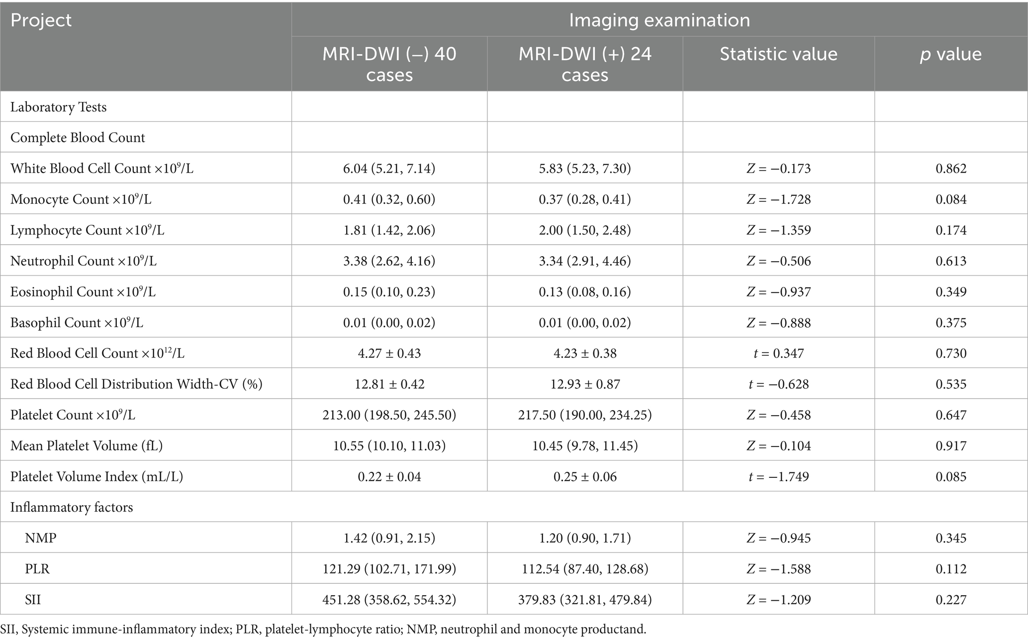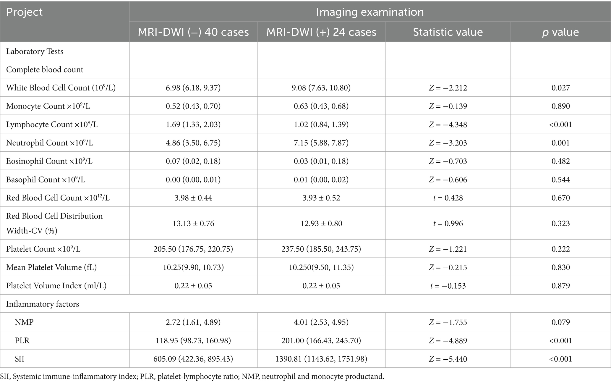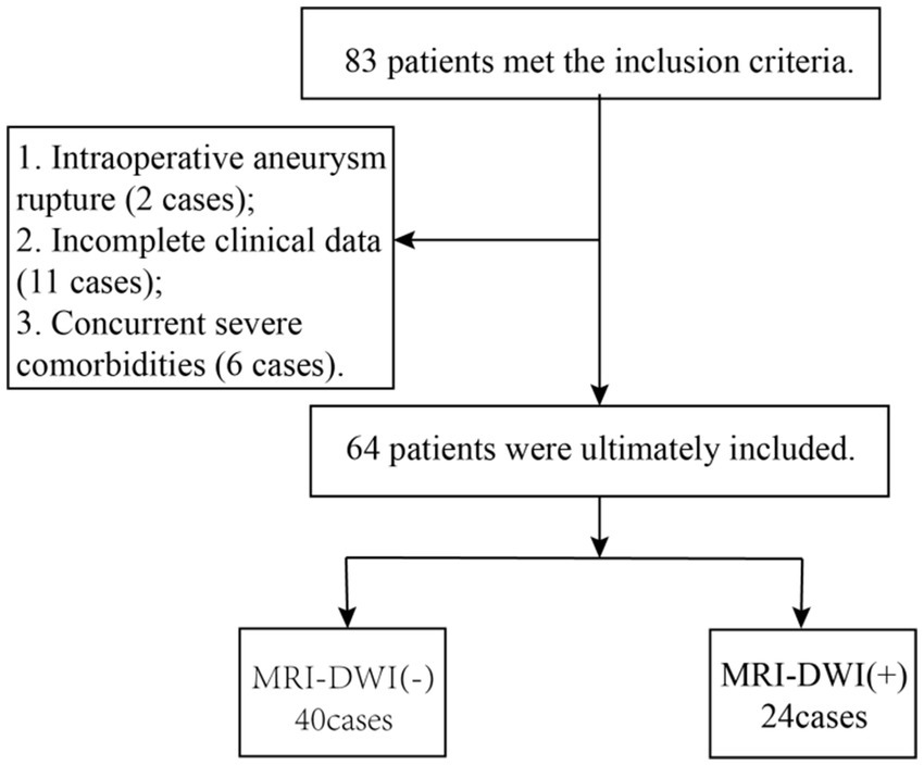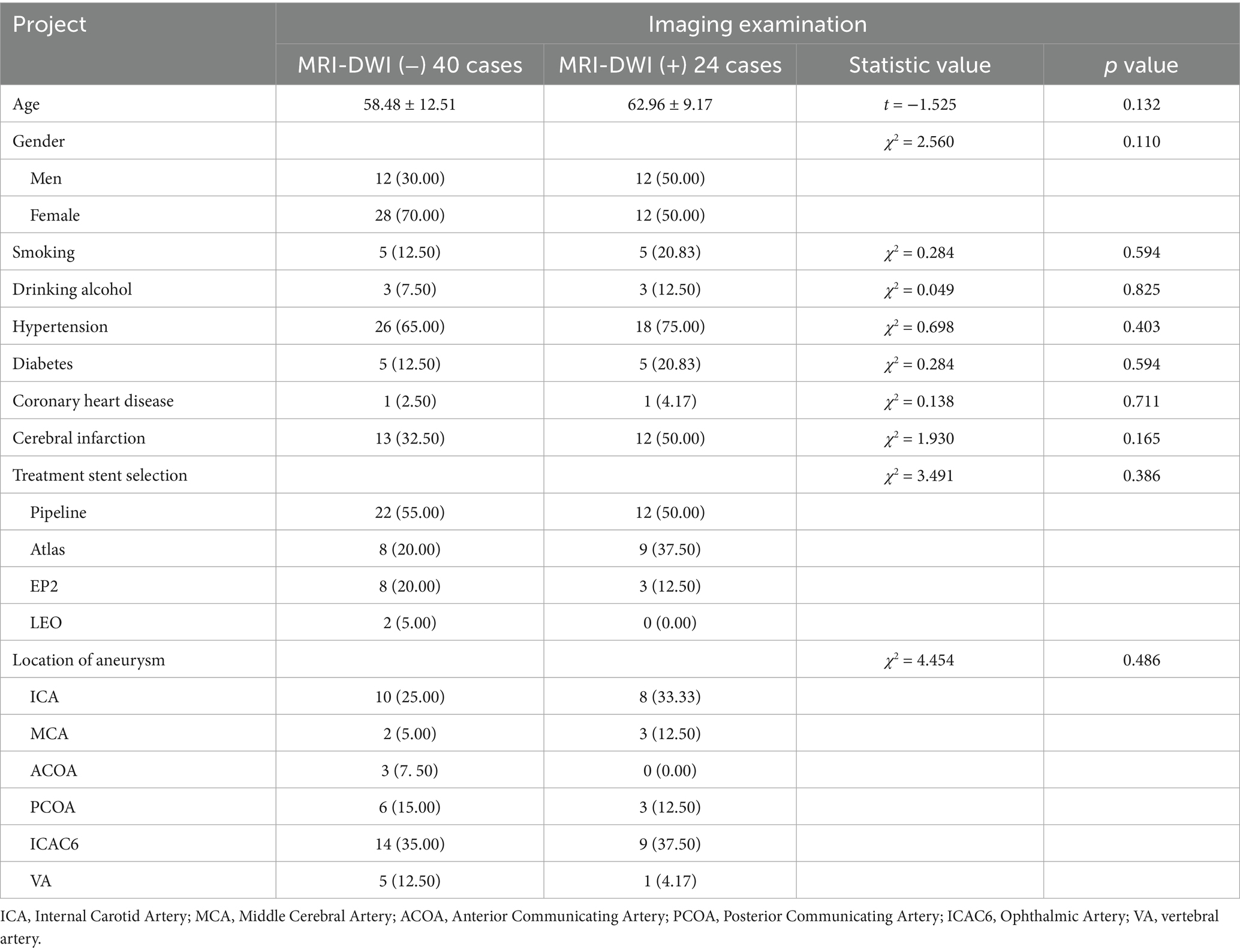 Eighty-three patients who underwent stent-assisted embolization for unruptured intracranial aneurysms were selected based on the inclusion criteria. After applying the exclusion criteria, 19 patients were excluded, leaving 64 patients for the final analysis. The screening process is shown in Figure 1. Baseline clinical characteristics are shown in Table 1. Of the 64 patients, 24 (37.5%) had positive imaging findings and 40 (62.5%) had negative findings. The MRI-DWI (+) group had higher postoperative white blood cell and neutrophil counts, as well as higher PLR and SII, than the MRI-DWI (−) group. These differences were statistically significant (p < 0.05). However, the MRI-DWI (+) group had lower postoperative lymphocyte counts than the MRI-DWI (−) group, and these differences were also statistically significant (p < 0.05) (see Tables 1–3).