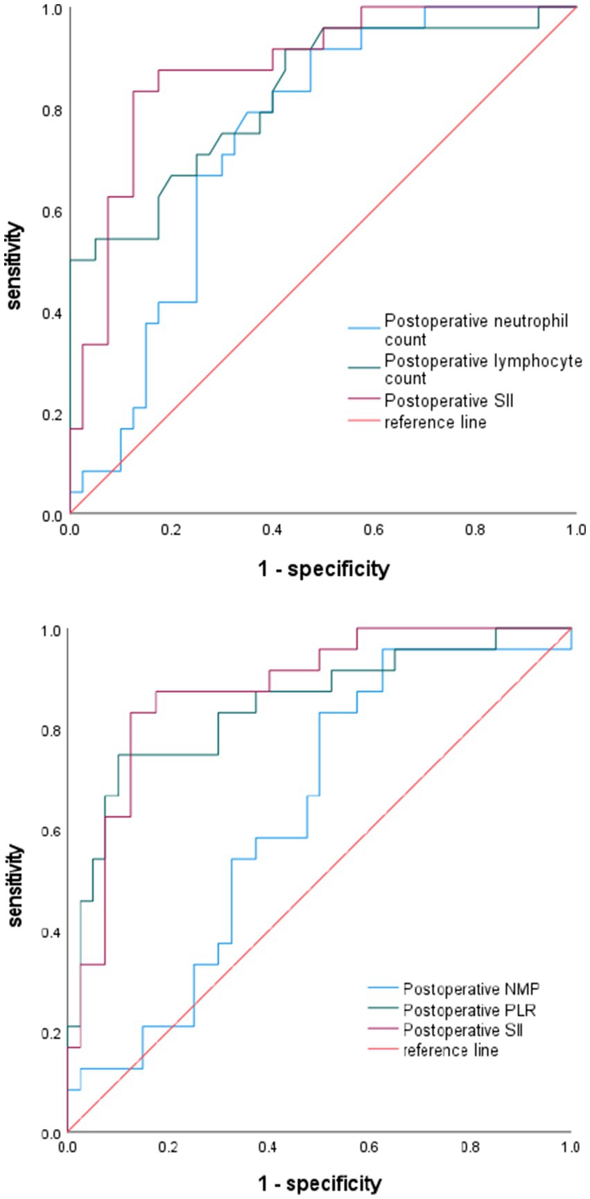 Figure 2. Diagnostic value of neutrophil count, lymphocyte count, NMP, PLR, and SII for postoperative infarction.
