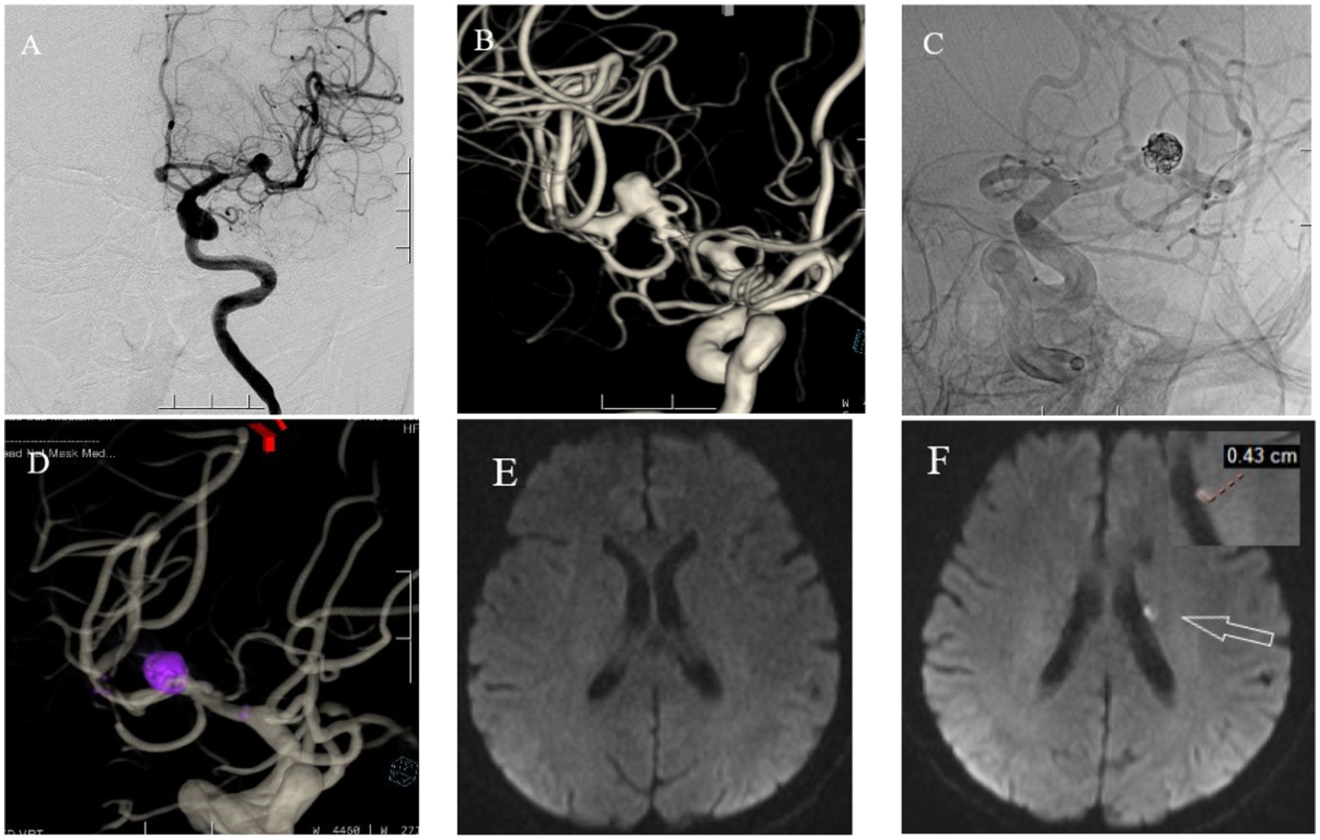 Figure 3. A 71 year old female with headaches, dizziness, and transient fainting for half a month. (A) Cranial DSA showing the location of the intracranial aneurysm in the 2D plane during the operation. (B) Cranial DSA showing a 3D image of the left middle cerebral artery aneurysm. (C) Intraoperative 2D plane showing the placement of coils and stents. (D) Postoperative 3D plane showing the placement of coils and stents. (E) Preoperative MRI-DWI showed no new infarcts. (F) Postoperative MRI-DWI on day three showed an acute microinfarction lesion in the left periventricular region with a diameter of approximately 0.43 cm.