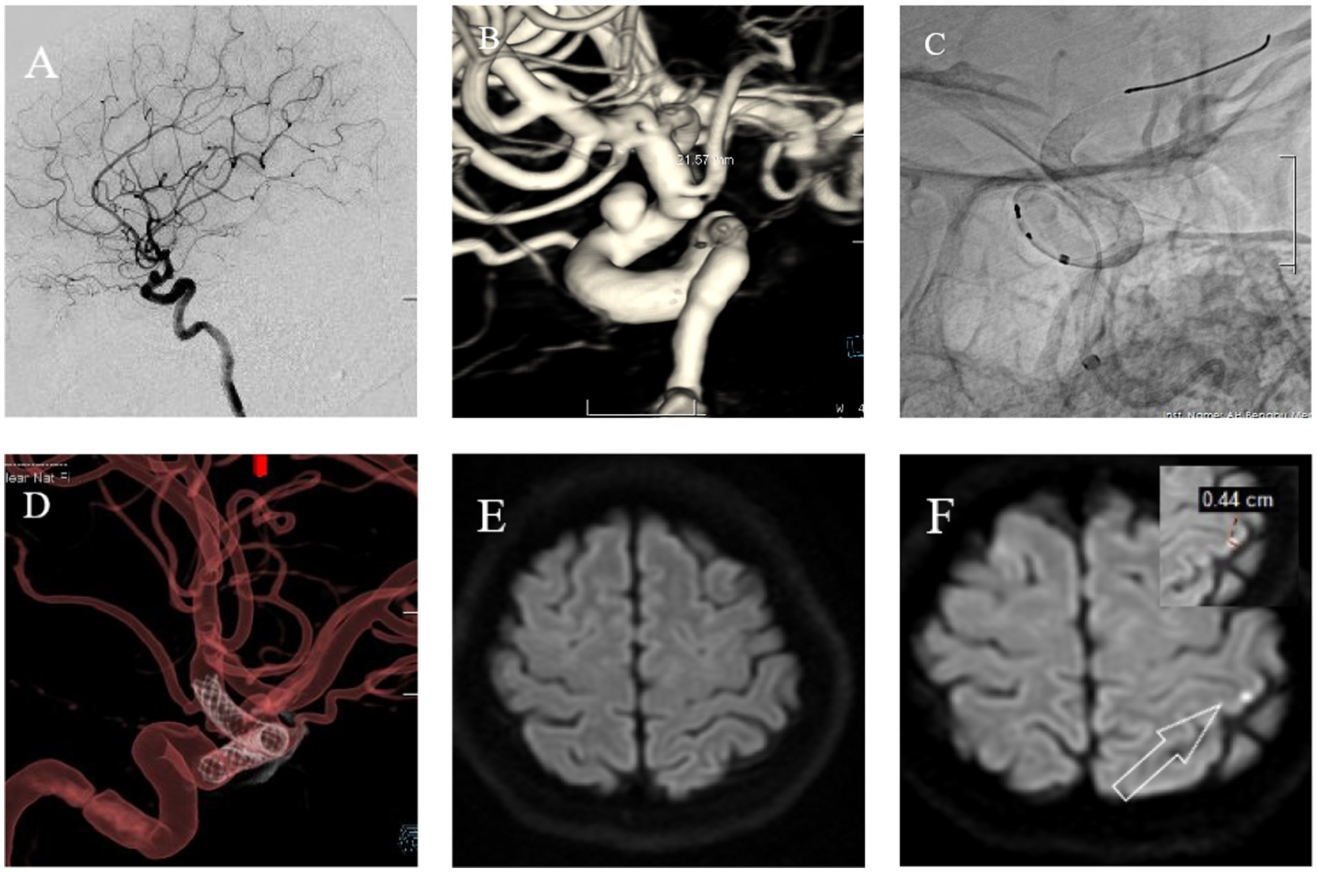 Figure 4. Female, 56 years old. Intermittent headaches for over 7 months, worsening for 1 week. (A) Cranial DSA showing the location of the intracranial aneurysm in the 2D plane during the operation. (B) Cranial DSA showing the location of the aneurysm in the 3D image, confirming it is in the ophthalmic artery segment of the left internal carotid artery. (C) Intraoperative 2D plane showing the location of the stent. (D) Postoperative 3D plane showing the stent model. (E) Preoperative MRI-DWI showed no new infarcts. (F) Postoperative day 3 MRI-DWI showed an acute microinfarction lesion in the left parietal lobe with a diameter of approximately 0.44 cm.