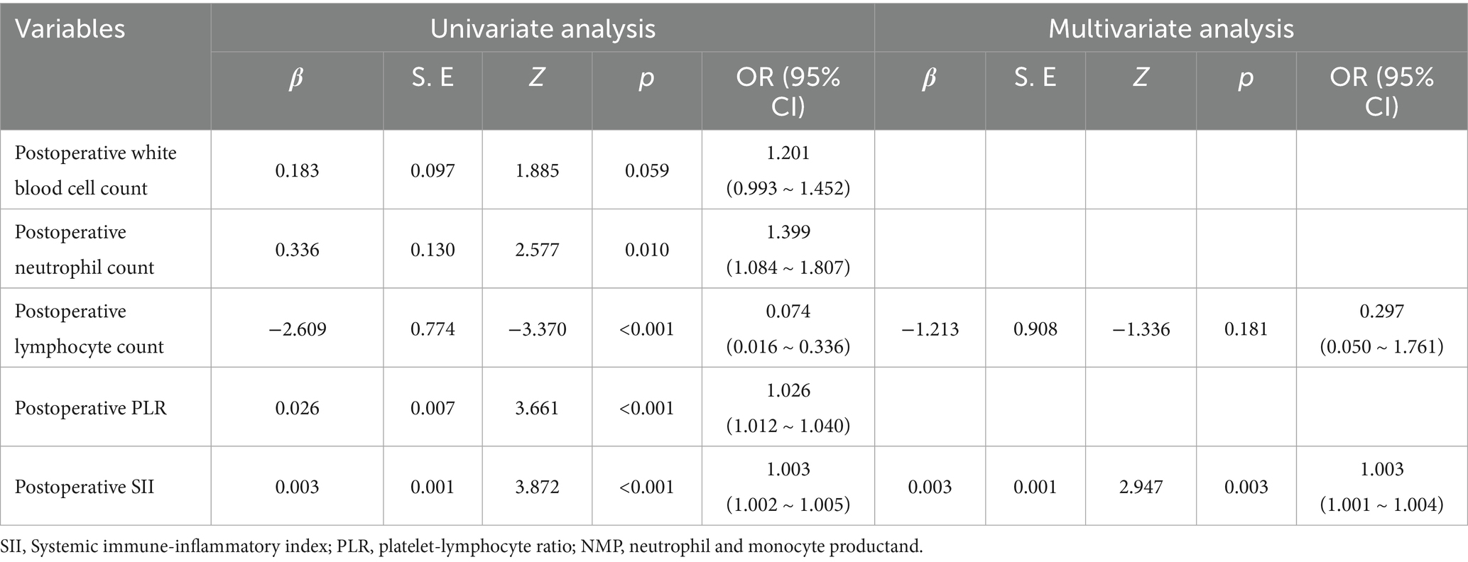 Variables that showed statistically significant differences in Tables 1–3 were included in the univariate logistic regression analysis. The results of the analysis showed that: Postoperative neutrophil count (p = 0.010), postoperative lymphocyte count (p < 0.001), postoperative PLR (p < 0.001), and postoperative SII (p < 0.001) were statistically significant. Variables with p < 0.05 in the univariate analysis were included in the multivariate analysis. Variable selection was performed using stepwise regression. The findings of this study suggest that postoperative SII is an independent factor influencing microembolization following stent-assisted repair of unruptured intracranial aneurysms (p < 0.05) (see Table 4).