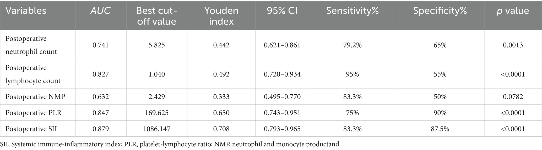 The diagnostic specificity of SII was assessed by plotting its ROC curve and comparing it with postoperative neutrophil count, postoperative lymphocyte count, postoperative NMP, and postoperative PLR. The findings indicated that the SII effectively predicted new microinfarction following stent-assisted treatment for unruptured intracranial aneurysms, with an area under the curve (AUC) of 0.879 [95% confidence interval (CI): 0.793–0.965, p < 0.0001]. The optimal cutoff value for the SII was determined to be 1086.147, with sensitivity and specificity values of 83.3 and 87.5%, respectively. SII exhibited superior predictive accuracy for post-operative new-onset microinfarction in comparison to post-operative neutrophil count (AUC 0.879 vs. 0.741, p = 0.008), as well as post-operative lymphocyte count (AUC 0.879 vs. 0.827, p = 0.329). Additionally, SII demonstrated comparable predictive accuracy for postoperative PLR (AUC 0.879 vs. 0.847, p = 0.412). Postoperative NMP demonstrated no substantial predictive capacity for new-onset microinfarction following stent-assisted treatment of unruptured intracranial aneurysms (AUC 0.632, p = 0.0782) (Figure 2; Table 5).
