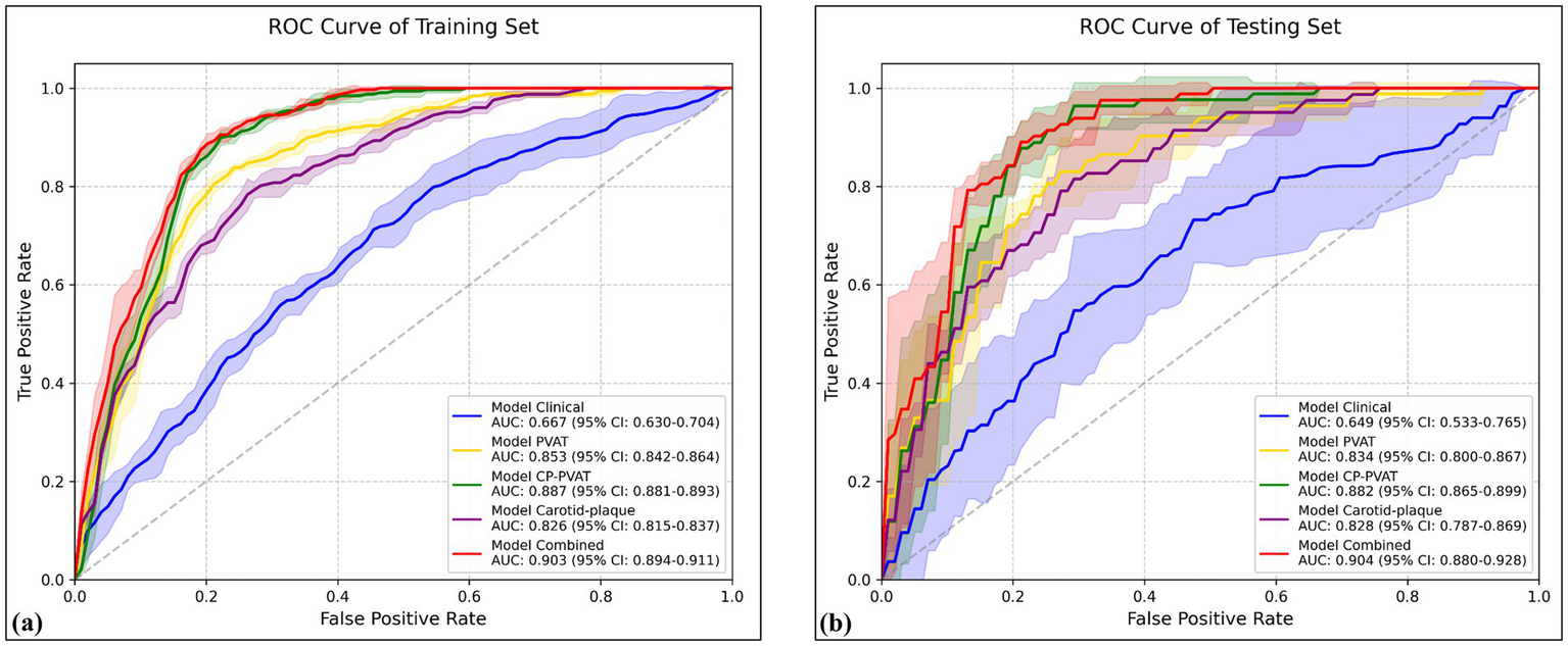 The combined model, which integrated CP-PVAT features and clinical factors, achieved excellent discriminative performance, with mean AUCs of 0.903 and 0.904 in the training and testing sets, respectively. It significantly outperformed models based solely on carotid plaque, PVAT, CP-PVAT or clinical factors (p < 0.05, DeLong’s test). SHAP analysis demonstrated that radiomics features provided complementary information, enhancing model interpretability and clinical relevance.