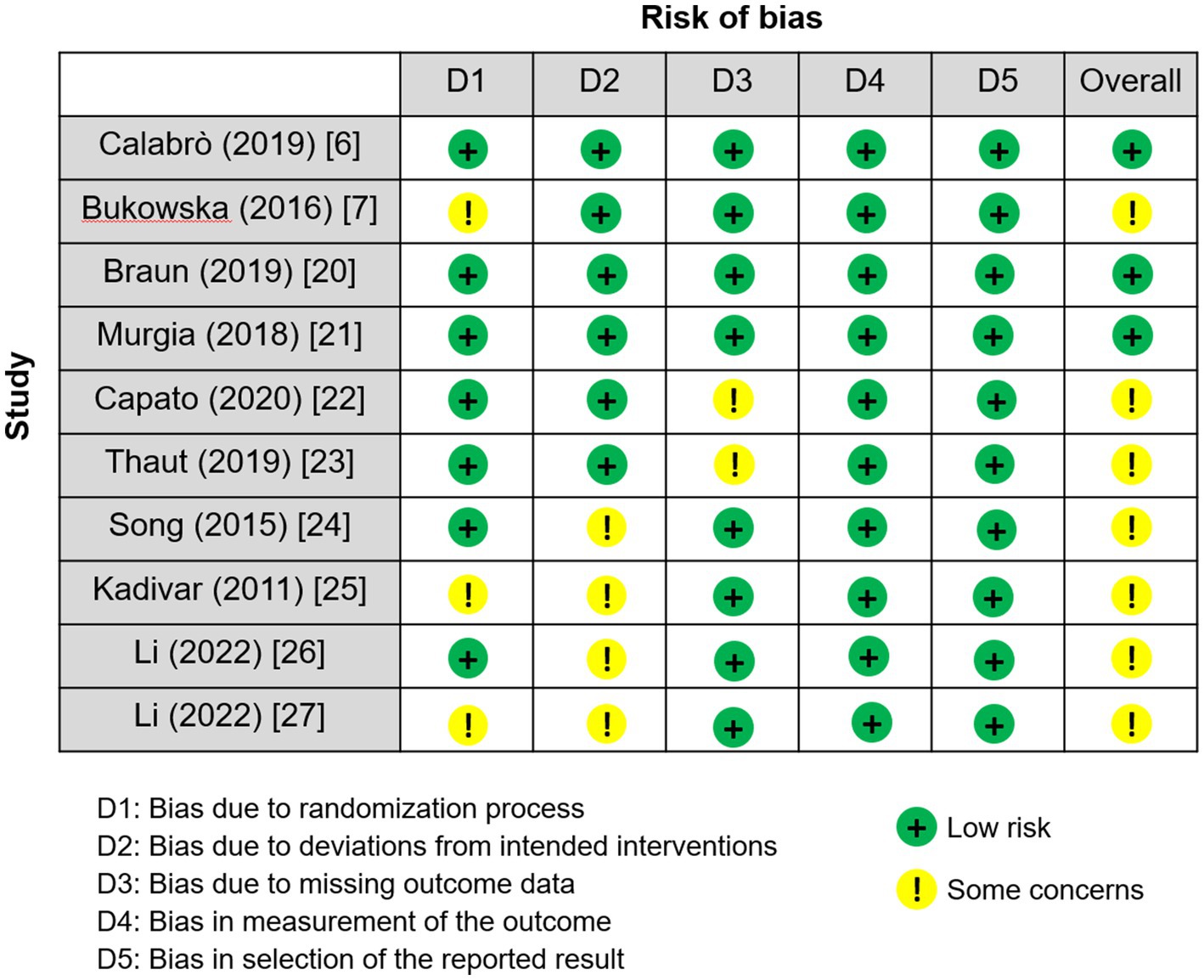 Figure 3. Risk-of-bias summary (6, 7, 20–27). Each study was evaluated across the five domains of RoB 2, with judgments categorized as low risk, some concerns, or high risk.