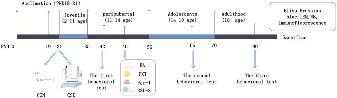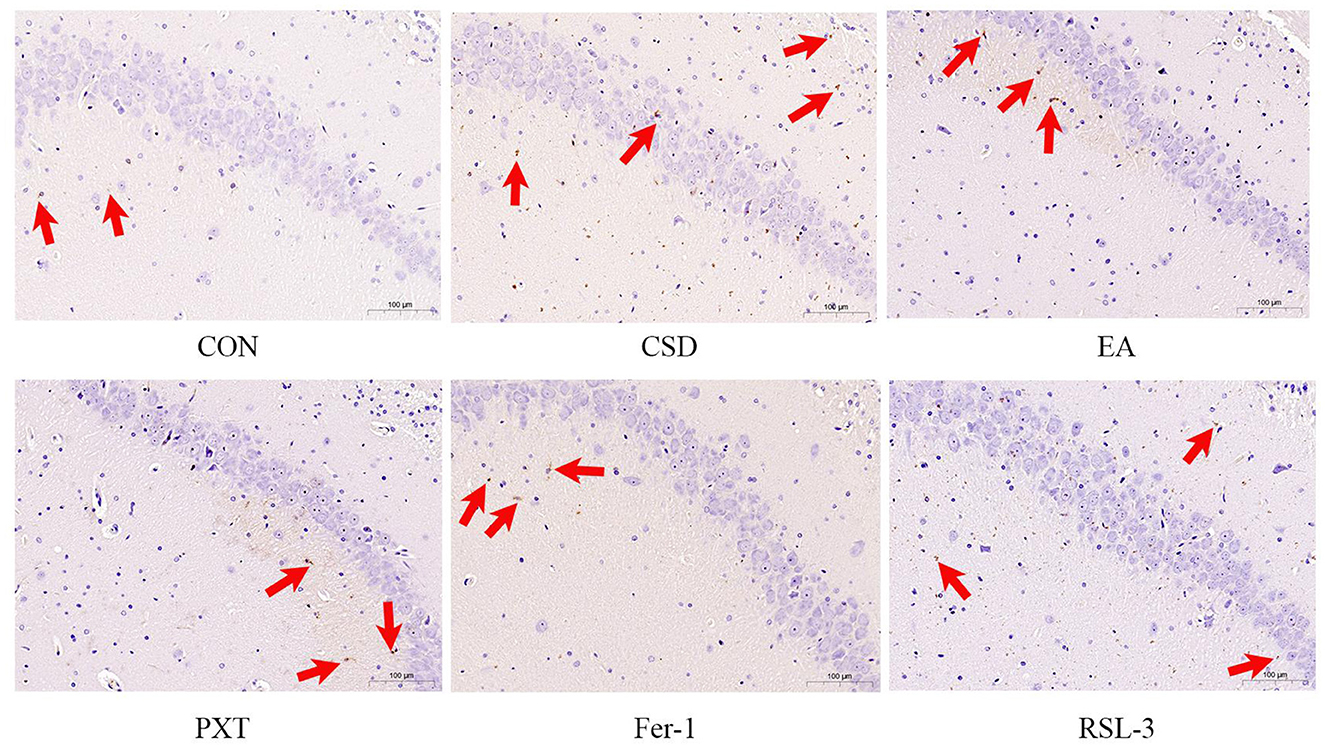 In the EA group, four acupoints were selected for the study: Baihui (GV20), Yintang (GV29), Hegu (LI4), and Taichong (LR3). The acupoint selection was based on the 14th Five-Year Plan Textbook of Acupuncture and Moxibustion edited by Liang Fanrong and Zhao Jiping. Acupoint localization was performed with reference to “Nomenclature and Location of Commonly Used Acupoints in Laboratory Animals, Part II: Rat.” GV20, known as Baihui, is located along the midline of the rat's parietal bone; GV29, or Yintang, rests precisely at the midpoint where the peaks of both orbital rims meet; Hegu, at LI4, can be found sandwiched between the first and second bones of the forelimb's metacarpals; and LR3, or Taichong, lies nestled in the hollow space between the first and second bones on the top of the hindlimb. In a controlled setting, the rodents were secured on a specialized rat grip, lying belly-down, and the skin areas for acupuncture were meticulously sanitized. During the procedure, pre-sterilized, single-use, stainless steel needles measuring 0.20 mm in diameter and 13 mm in length were applied. The needles were placed at Hegu and Taichong points straight into the skin, to a depth of 2 mm, and this was done on both sides alternately. For the Baihui and Yintang points, the needles were inserted at a 15-degree angle to the skin, reaching a depth of 2 mm—no electrical stimulation was administered, and the needles were left in place. The electroacupuncture device (SDZ-II, manufactured by Suzhou Huatuo in Suzhou, China) was set up with its anode and cathode attached to the Hegu and Taichong points on the same side of the body. Using intermittent pulses at frequencies ranging from 2 to 10 Hz and currents between 1 and 1.2 mA, the stimulation intensity was carefully calibrated until the rat showed no signs of distress or resistance. Each session lasted 20 min and was conducted once daily for 18 consecutive days, from PND 46 to PND 64. Following the completion of the modeling phase, rats in the PXT group received daily oral doses of PXT (10 mg/kg) over an 18-day period. Similarly, the Fer-1 group was administered Fer-1 (20 mg/kg) via intraperitoneal injection once per day for the same duration. In the RSL-3 group, rats were given intraperitoneal injections of RSL-3 (100 mg/kg) followed by daily electroacupuncture sessions, mirroring the protocol used in the EA group. Meanwhile, the CON, CSD, PXT, and Fer-1 groups underwent identical handling and restraint procedures as the electroacupuncture groups each day—just without the electrical stimulation component—to ensure consistent experimental conditions.