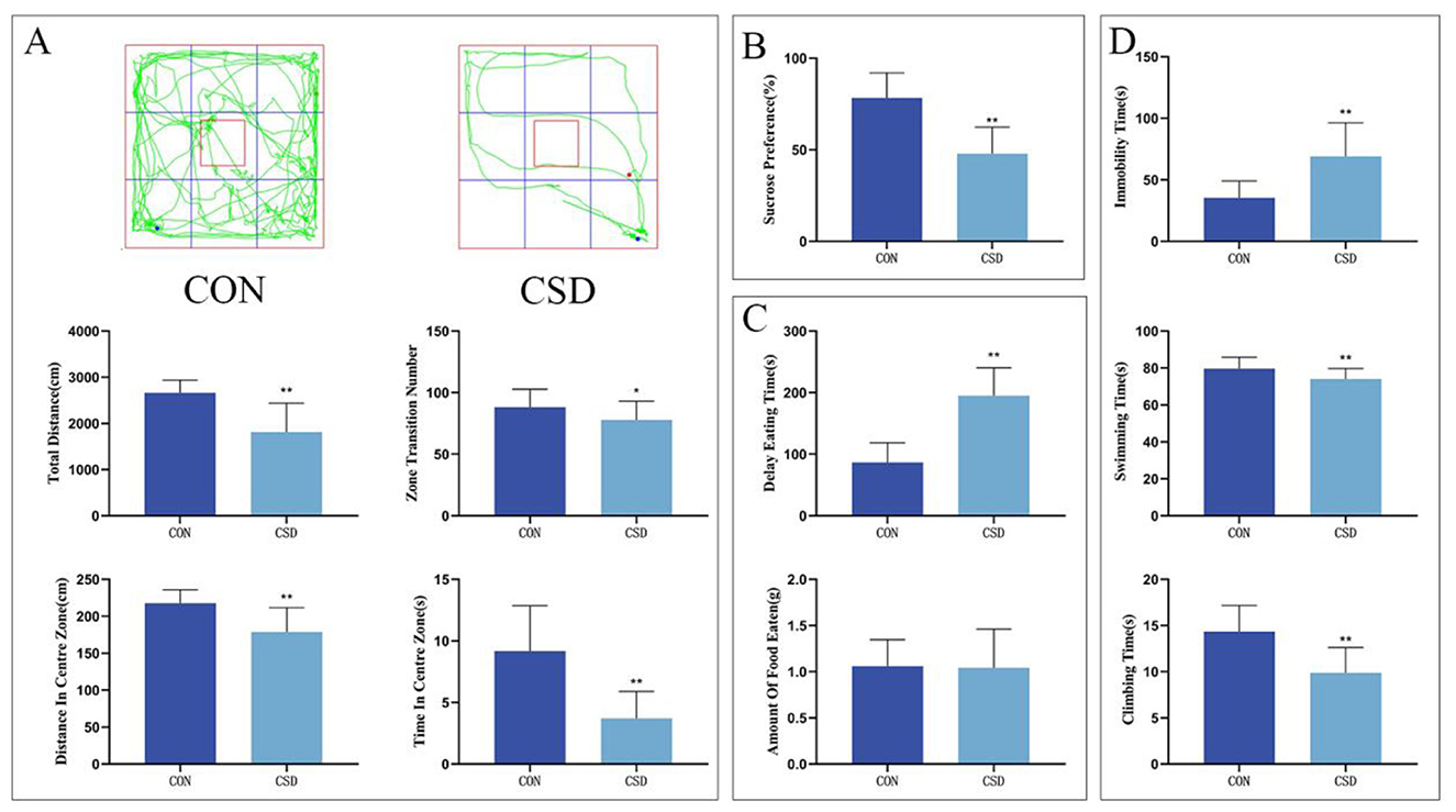 Figure 2. (A) From top to bottom: OFT trajectory maps of rats in each group on PND 43, total distance traveled by rats in the open field, total number of grid crossings by rats in the open field, total distance traveled by rats in the central area, and time spent by rats in the central area. (B) Sucrose preference rates of rats in each group on PND 42. (C) Latency to feed and amount of food consumed by rats on PND 44. (D) Immobility ratio, swimming duration ratio, and struggling duration ratio of rats on PND 45 (CON group, n = 12; CSD group, n = 60). *P < 0.05, **P < 0.01 compared with the CON group.