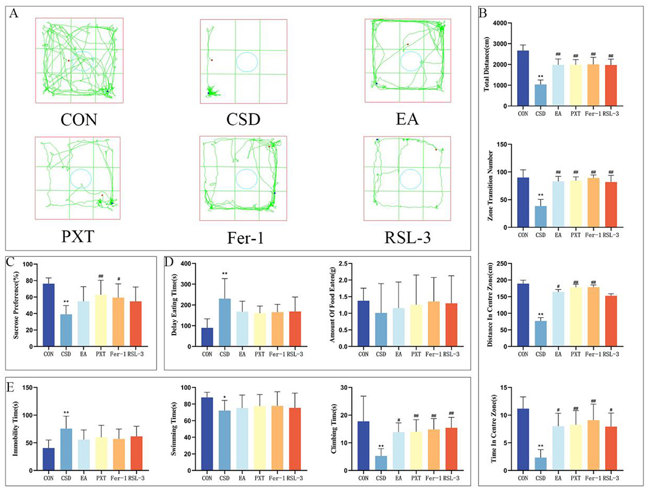 When we ran the NSFT on PND 92, the CSD group took considerably longer to start eating (P < 0.01) and didn't eat nearly as much (P < 0.05) compared to the CON group. On the flip side, the EA, PXT, Fer-1, and RSL-3 groups showed a marked decrease in how long it took them to begin feeding compared to the CSD group (P < 0.01, P < 0.05) (as shown in Figure 4D).