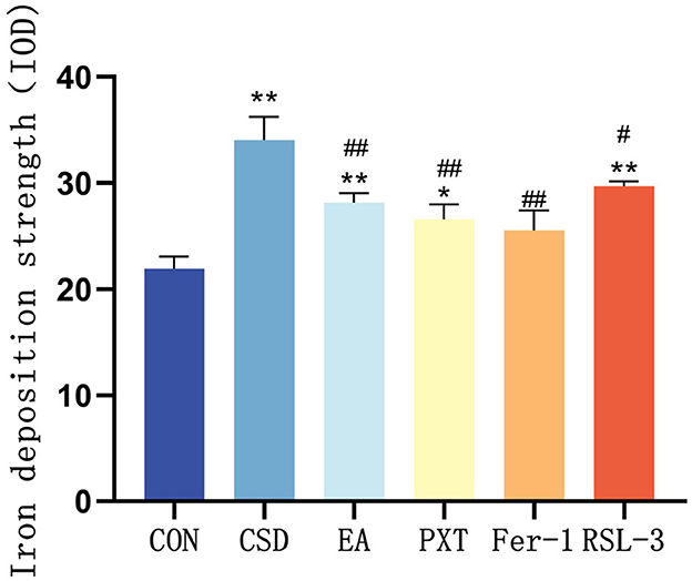 Quantitative analysis of iron deposition (IOD value) further confirmed these observations. Compared with the CON group, the CSD group exhibited a significantly higher IOD value (P < 0.01), suggesting pronounced hippocampal iron overload. Compared with the CSD group, the EA, PXT, and Fer-1 groups all showed significantly reduced iron deposition levels (P < 0.01), indicating that these interventions effectively alleviated CSD-induced disturbances in iron metabolism. Among them, the Fer-1 group exhibited the greatest reduction, consistent with its direct ferroptosis-inhibitory mechanism, while the EA group showed a comparable degree of reduction, suggesting that electroacupuncture can indirectly regulate iron metabolism. The RSL-3 group exhibited a slight decrease in IOD compared with the CSD group (P < 0.05), indicating that RSL-3 could induce ferroptosis and aggravate iron accumulation, although partial recovery was observed under electroacupuncture intervention (as shown in Figure 6).